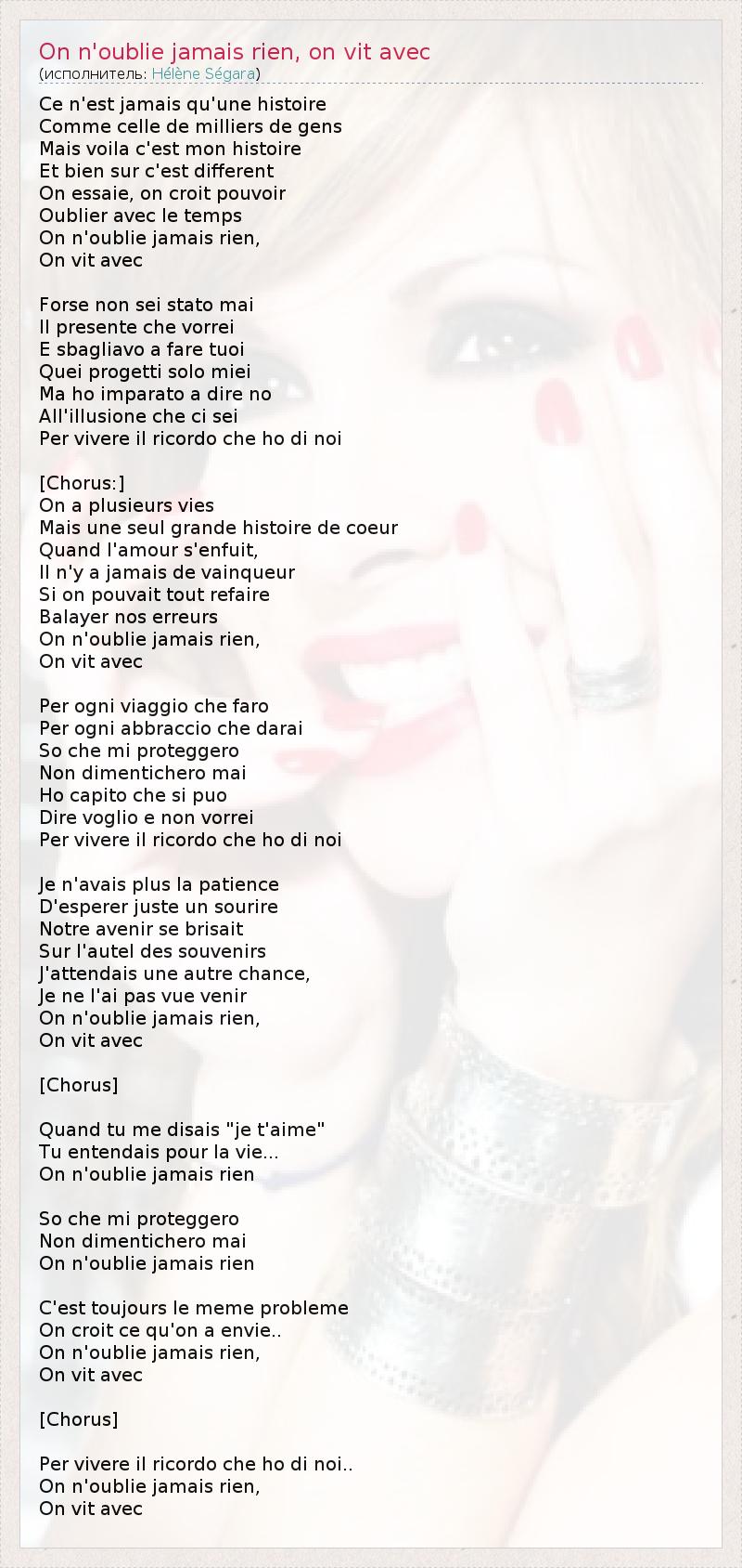 Ce n'est jamais qu'une histoire Comme celle de milliers de gens Mais voila c'est mon histoire Et bien sur c'est different On essaie, on croit pouvoir Oublier avec le temps On n'oublie jamais rien, Оn vit avec Forse non sei stato mai Il presente che vorrei E sbagliavo a fare tuoi Quei progetti solo miei Ma ho imparato a dire no All'illusione che ci sei Per vivere il ricordo che ho di noi [Chorus:] On a plusieurs vies Mais une seul grande histoire de coeur Quand l'amour s'enfuit, Il n'y a jamais de vainqueur Si on pouvait tout refaire Balayer nos erreurs On n'oublie jamais rien, Оn vit avec Per ogni viaggio che faro Per ogni abbraccio che darai So che mi proteggero Non dimentichero mai Ho capito che si puo Dire voglio e non vorrei Per vivere il ricordo che ho di noi Je n'avais plus la patience D'esperer juste un sourire Notre avenir se brisait Sur l'autel des souvenirs J'attendais une autre chance, Je ne l'ai pas vue venir On n'oublie jamais rien, Оn vit avec [Chorus] Quand tu me disais "je t'aime" Tu entendais pour la vie... On n'oublie jamais rien So che mi proteggero Non dimentichero mai On n'oublie jamais rien C'est toujours le meme probleme On croit ce qu'on a envie.. On n'oublie jamais rien, Оn vit avec [Chorus] Per vivere il ricordo che ho di noi.. On n'oublie jamais rien, Оn vit avec