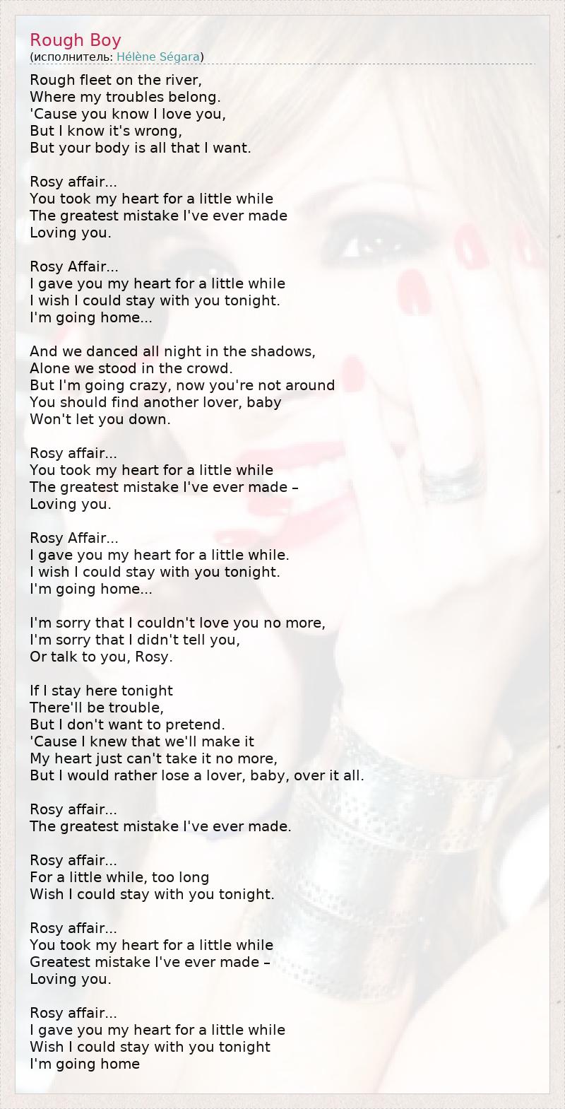 Rough fleet on the river, Where my troubles belong. 'Cause you know I love you, But I know it's wrong, But your body is all that I want. Rosy affair... You took my heart for a little while The greatest mistake I've ever made Loving you. Rosy Affair... I gave you my heart for a little while I wish I could stay with you tonight. I'm going home... And we danced all night in the shadows, Alone we stood in the crowd. But I'm going crazy, now you're not around You should find another lover, baby Won't let you down. Rosy affair... You took my heart for a little while The greatest mistake I've ever made – Loving you. Rosy Affair... I gave you my heart for a little while. I wish I could stay with you tonight. I'm going home... I'm sorry that I couldn't love you no more, I'm sorry that I didn't tell you, Or talk to you, Rosy. If I stay here tonight There'll be trouble, But I don't want to pretend. 'Cause I knew that we'll make it My heart just can't take it no more, But I would rather lose a lover, baby, over it all. Rosy affair... The greatest mistake I've ever made. Rosy affair... For a little while, too long Wish I could stay with you tonight. Rosy affair... You took my heart for a little while Greatest mistake I've ever made – Loving you. Rosy affair... I gave you my heart for a little while Wish I could stay with you tonight I'm going home