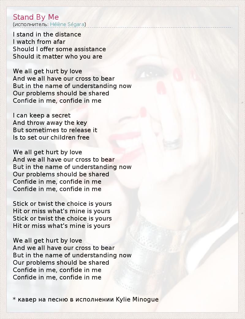 I stand in the distance I watch from afar Should I offer some assistance Should it matter who you are We all get hurt by love And we all have our cross to bear But in the name of understanding now Our problems should be shared Confide in me, confide in me I can keep a secret And throw away the key But sometimes to release it Is to set our children free We all get hurt by love And we all have our cross to bear But in the name of understanding now Our problems should be shared Confide in me, confide in me Confide in me, confide in me Stick or twist the choice is yours Hit or miss what's mine is yours Stick or twist the choice is yours Hit or miss what's mine is yours We all get hurt by love And we all have our cross to bear But in the name of understanding now Our problems should be shared Confide in me, confide in me Confide in me, confide in me * кавер на песню в исполнении Kylie Minogue
