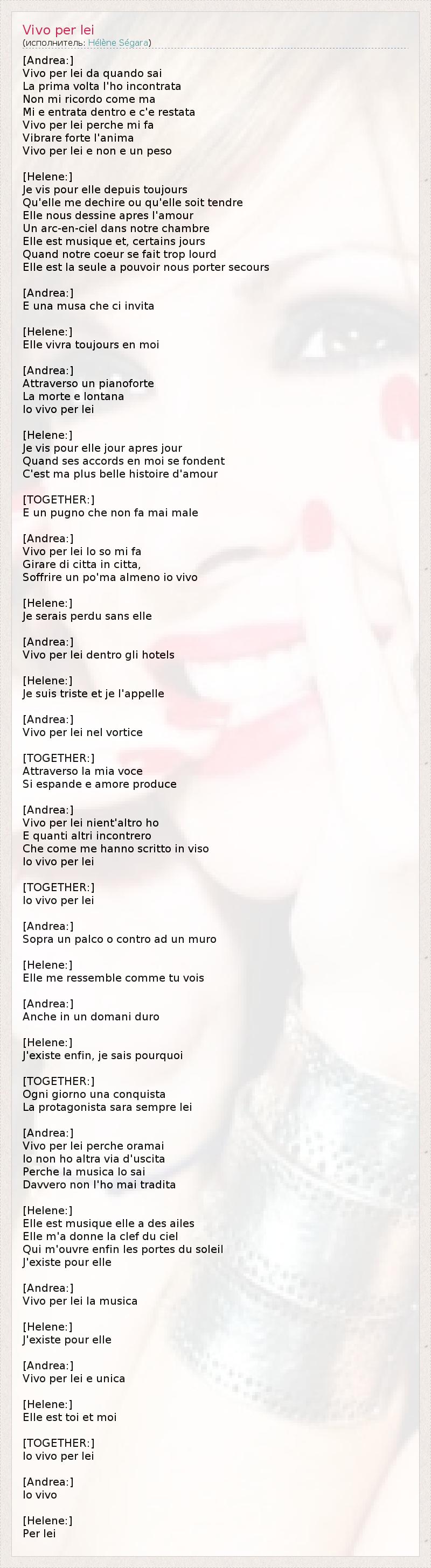 [Andrea:] Vivo per lei da quando sai La prima volta l'ho incontrata Non mi ricordo come ma Mi e entrata dentro e c'e restata Vivo per lei perche mi fa Vibrare forte l'anima Vivo per lei e non e un peso [Helene:] Je vis pour elle depuis toujours Qu'elle me dechire ou qu'elle soit tendre Elle nous dessine apres l'amour Un arc-en-ciel dans notre chambre Elle est musique et, certains jours Quand notre coeur se fait trop lourd Elle est la seule a pouvoir nous porter secours [Andrea:] E una musa che ci invita [Helene:] Elle vivra toujours en moi [Andrea:] Attraverso un pianoforte La morte e lontana Io vivo per lei [Helene:] Je vis pour elle jour apres jour Quand ses accords en moi se fondent C'est ma plus belle histoire d'amour [TOGETHER:] E un pugno che non fa mai male [Andrea:] Vivo per lei lo so mi fa Girare di citta in citta, Soffrire un po'ma almeno io vivo [Helene:] Je serais perdu sans elle [Andrea:] Vivo per lei dentro gli hotels [Helene:] Je suis triste et je l'appelle [Andrea:] Vivo per lei nel vortice [TOGETHER:] Attraverso la mia voce Si espande e amore produce [Andrea:] Vivo per lei nient'altro ho E quanti altri incontrero Che come me hanno scritto in viso Io vivo per lei [TOGETHER:] Io vivo per lei [Andrea:] Sopra un palco o contro ad un muro [Helene:] Elle me ressemble comme tu vois [Andrea:] Anche in un domani duro [Helene:] J'existe enfin, je sais pourquoi [TOGETHER:] Ogni giorno una conquista La protagonista sara sempre lei [Andrea:] Vivo per lei perche oramai Io non ho altra via d'uscita Perche la musica lo sai Davvero non l'ho mai tradita [Helene:] Elle est musique elle a des ailes Elle m'a donne la clef du ciel Qui m'ouvre enfin les portes du soleil J'existe pour elle [Andrea:] Vivo per lei la musica [Helene:] J'existe pour elle [Andrea:] Vivo per lei e unica [Helene:] Elle est toi et moi [TOGETHER:] Io vivo per lei [Andrea:] Io vivo [Helene:] Per lei