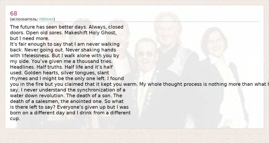The future has seen better days. Always, closed doors. Open old sores. Makeshift Holy Ghost, but I need more. It's fair enough to say that I am never walking back. Never going out. Never shaking hands with lifelessness. But I walk alone with you by my side. You've given me a thousand tries. Headlines. Half truths. Half life and it's half used. Golden hearts, silver tongues, slant rhymes and I might be the only one left. I found you in the fire but you claimed that it kept you warm. My whole thought process is nothing more than what I say. I never understand the synchronization of a water down revolution. The death of a son. The death of a salesmen, the anointed one. So what is there left to say? Everyone's given up but I was born on a different day and I drink from a different cup.