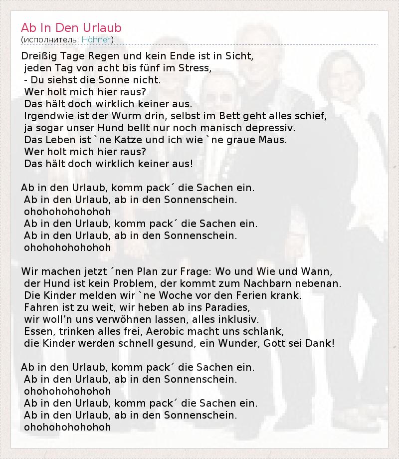 Dreissig Tage Regen унд Kein Ende IST в Sicht, Jeden Tag фон Acht бис fünf им Стресс, - Du siehst умереть Sonne Nicht. Wer Холт Мичиган HIER Раус? Das остановить Дочь Wirklich Keiner Aus. Irgendwie IST дер Wurm Дрина, Ванесса им Бетт Geht Alles schief, JA Sogar UNSER Пёс bellt Нур Ночь manisch depressiv. Das Leben IST `пе Катце унд Ich Wie` пе Graue Maus. Wer Холт Мичиган HIER Раус? Das остановить Дочь Wirklich Keiner AUS! Ab в ден Urlaub, Комм pack' умереть Сачен EIN. Ab в ден Urlaub, AB в ден Sonnenschein. ohohohohohohoh Ab в ден Urlaub, Комм pack' умереть Сачен EIN. Ab в ден Urlaub, AB в ден Sonnenschein. ohohohohohohoh Wir Machen Jetzt'nen План Zur Frage: Wo унд Wie унд Wann, дер Пёс IST Kein Проблема, дер Kommt Zum Nachbarn nebenan. Die Kinder Melden Wir `пе Woche вор ден FERIEN Krank. Fahren IST цу Weit, Wir heben AB модули Paradies, Wir woll'n UNS verwöhnen Лассен, Alles Inklusiv. Эссен, Trinken Alles Фрей, аэробика Macht UNS Schlank, умереть Kinder Верден SCHNELL Gesund, Эйн Wunder Готт сеи Данк! Ab в ден Urlaub, Комм pack' умереть Сачен EIN. Ab в ден Urlaub, AB в ден Sonnenschein. ohohohohohohoh Ab в ден Urlaub, Комм pack' умереть Сачен EIN. Ab в ден Urlaub, AB в ден Sonnenschein. ohohohohohohoh