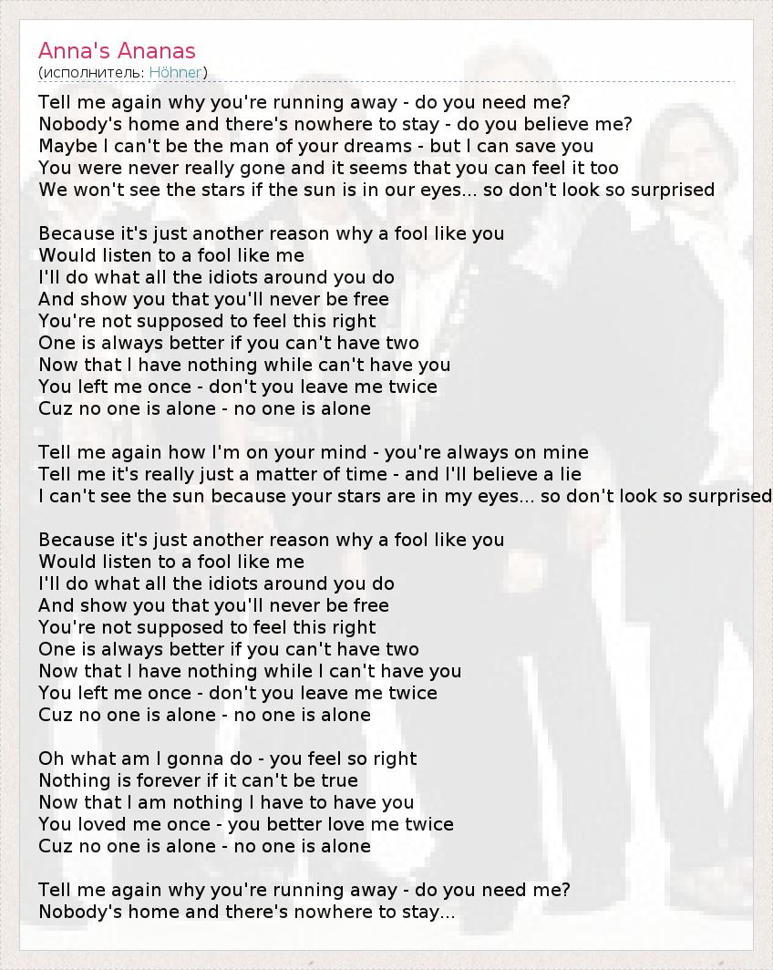 Tell me again why you're running away - do you need me? Nobody's home and there's nowhere to stay - do you believe me? Maybe I can't be the man of your dreams - but I can save you You were never really gone and it seems that you can feel it too We won't see the stars if the sun is in our eyes... so don't look so surprised Because it's just another reason why a fool like you Would listen to a fool like me I'll do what all the idiots around you do And show you that you'll never be free You're not supposed to feel this right One is always better if you can't have two Now that I have nothing while can't have you You left me once - don't you leave me twice Cuz no one is alone - no one is alone Tell me again how I'm on your mind - you're always on mine Tell me it's really just a matter of time - and I'll believe a lie I can't see the sun because your stars are in my eyes... so don't look so surprised Because it's just another reason why a fool like you Would listen to a fool like me I'll do what all the idiots around you do And show you that you'll never be free You're not supposed to feel this right One is always better if you can't have two Now that I have nothing while I can't have you You left me once - don't you leave me twice Cuz no one is alone - no one is alone Oh what am I gonna do - you feel so right Nothing is forever if it can't be true Now that I am nothing I have to have you You loved me once - you better love me twice Cuz no one is alone - no one is alone Tell me again why you're running away - do you need me? Nobody's home and there's nowhere to stay...