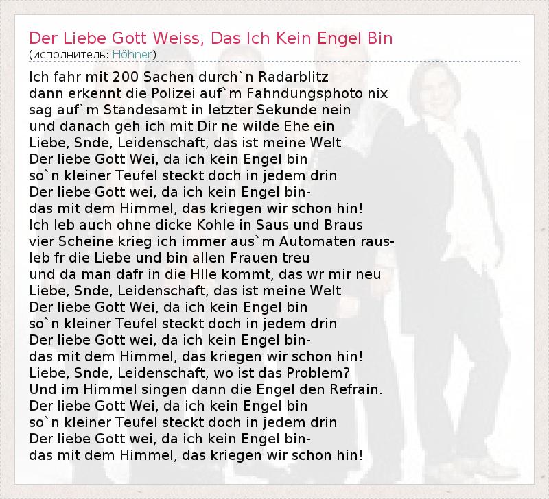 Ich fahr mit 200 Sachen durch`n Radarblitz dann erkennt die Polizei auf`m Fahndungsphoto nix sag auf`m Standesamt in letzter Sekunde nein und danach geh ich mit Dir ne wilde Ehe ein Liebe, Snde, Leidenschaft, das ist meine Welt Der liebe Gott Wei, da ich kein Engel bin so`n kleiner Teufel steckt doch in jedem drin Der liebe Gott wei, da ich kein Engel bin- das mit dem Himmel, das kriegen wir schon hin! Ich leb auch ohne dicke Kohle in Saus und Braus vier Scheine krieg ich immer aus`m Automaten raus- leb fr die Liebe und bin allen Frauen treu und da man dafr in die Hlle kommt, das wr mir neu Liebe, Snde, Leidenschaft, das ist meine Welt Der liebe Gott Wei, da ich kein Engel bin so`n kleiner Teufel steckt doch in jedem drin Der liebe Gott wei, da ich kein Engel bin- das mit dem Himmel, das kriegen wir schon hin! Liebe, Snde, Leidenschaft, wo ist das Problem? Und im Himmel singen dann die Engel den Refrain. Der liebe Gott Wei, da ich kein Engel bin so`n kleiner Teufel steckt doch in jedem drin Der liebe Gott wei, da ich kein Engel bin- das mit dem Himmel, das kriegen wir schon hin!