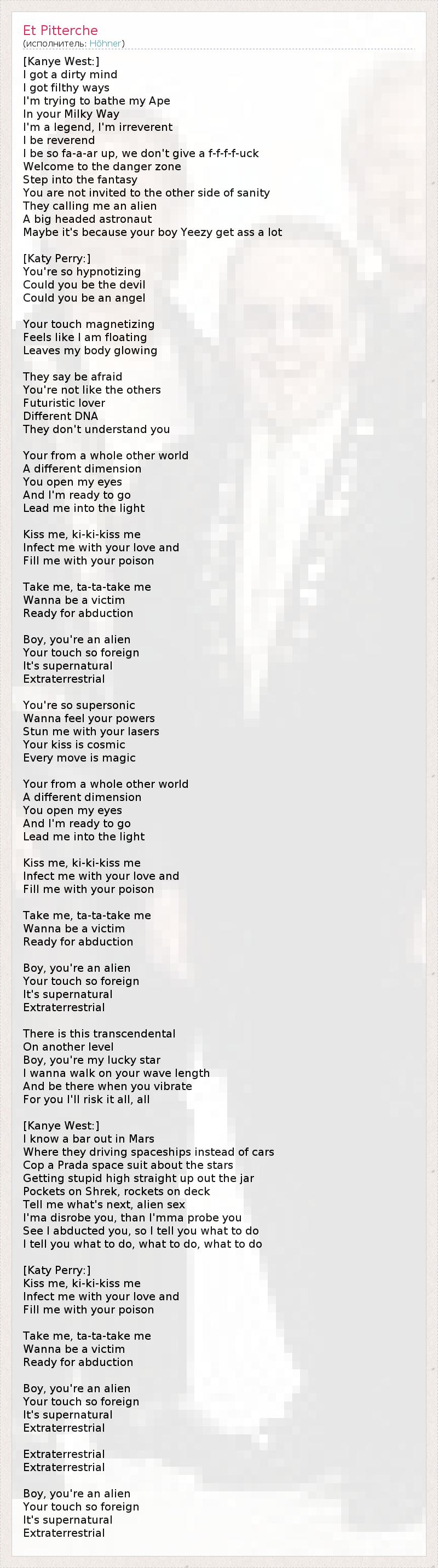 [Kanye West:] У меня грязные мыслишки и Вульгарные привычки, Пытаюсь искупать своего громилу* В твоем Млечном Пути, Я легенда, я не выказываю никакого уважения, Будете звать меня Ваше Преподобие, Я буду так высокоооо, да нам пох, Добро пожаловать в опасную зону, Сделайте шаг навстречу фантазии, За гранью здравого рассудка вас не ждут, Меня называют пришельцем, Воображалой-астронавтом, Может, оттого что ваш Yeezy** этакий сукин сын [Katy Perry:] Ты так гипнотизируешь, Дьявол ты Или ангел? От твоих магнетических прикосновений Я словно парю И мое тело пылает Говорят, что мне стоит бояться, Ты не такой, как остальные, Фантастический любовник, Другое ДНК, Они не понимают тебя Ты из совсем другого мира, Другого измерения, Ты открываешь мне глаза, И я готова идти, Веди меня к свету Поцелуй меня, по-по-поцелуй меня, Отрави меня своей любовью И наполни меня своим ядом Возьми меня, во-во-возьми меня, Хочу быть твоей жертвой, Я готова к похищению Парень, ты пришелец, Твое прикосновение так незнакомо, Это сверхъестественно, Это что-то внеземное Ты быстрее звука, Я хочу почувствовать твою силу, Порази меня своим взглядом-лазером, Твой поцелуй – космический, Каждое движение – волшебство Ты из совсем другого мира, Другого измерения, Ты открываешь мне глаза, И я готова идти, Веди меня к свету Поцелуй меня, по-по-поцелуй меня, Отрави меня своей любовью И наполни меня своим ядом Возьми меня, во-во-возьми меня, Хочу быть твоей жертвой, Я готова к похищению Парень, ты пришелец, Твое прикосновение так незнакомо, Это сверхъестественно, Это что-то внеземное Это запредельный выход На новый уровень, Парень, ты моя счастливая звезда, Я хочу быть с тобой на одной волне, Быть рядом, когда по тебе идет вибрация, Ради тебя я рискну всем, всем [Kanye West:] Я знаю один бар на Марсе, Где вместо тачек катаются на звездолетах, Приобретают космические костюмчики от Прада, Напиваясь чем-нибудь безо льда и прямо с горла, Карманы зелени, следующее – залезть в ракету, Скажи мне, а что потом, внеземной секс, Я раздену тебя, затем ощупаю, Видишь, я тебя похитил, я скажу тебе, что делать, Я скажу тебе, что делать, что делать [Katy Perry:] Поцелуй меня, по-по-поцелуй меня, Отрави меня своей любовью И наполни меня своим ядом Возьми меня, во-во-возьми меня, Хочу быть твоей жертвой, Я готова к похищению Парень, ты пришелец, Твое прикосновение так незнакомо, Это сверхъестественно, Это что-то внеземное Внеземное Внеземное Парень, ты пришелец, Твое прикосновение так незнакомо, Это сверхъестественно, Это что-то внеземное * громила, хулиган – сленг. Буквально - большая обезьяна типа гориллы. Так называют и здорового развязного негра, и вообще любого парня, страдающего излишним энтузиазмом. В данном случае используется с секс. подтекстом. ** кличка Кэни Уэста