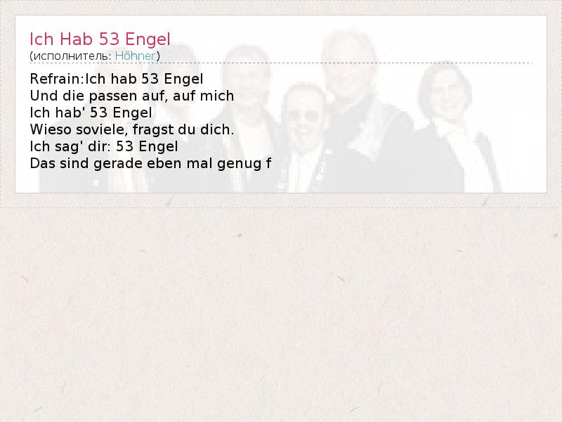 Refrain:Ich hab 53 Engel Und die passen auf, auf mich Ich hab' 53 Engel Wieso soviele, fragst du dich. Ich sag' dir: 53 Engel Das sind gerade eben mal genug f