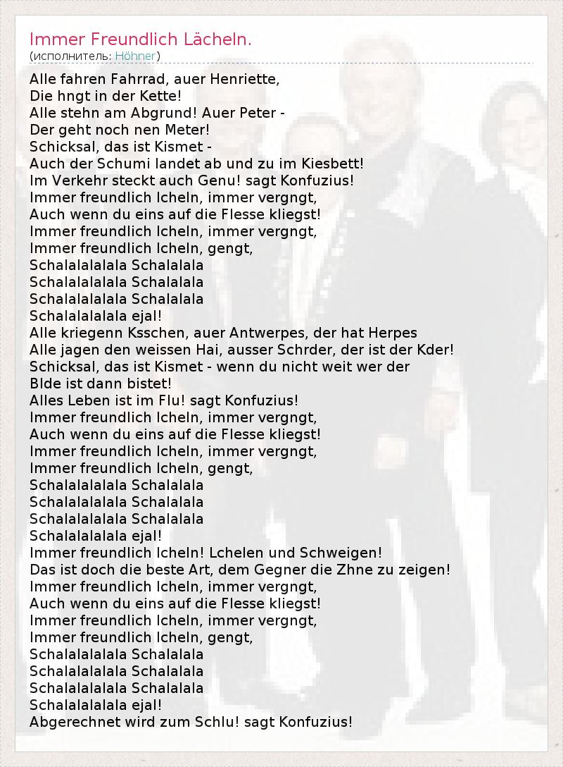 Alle fahren Fahrrad, auer Henriette, Die hngt in der Kette! Alle stehn am Abgrund! Auer Peter - Der geht noch nen Meter! Schicksal, das ist Kismet - Auch der Schumi landet ab und zu im Kiesbett! Im Verkehr steckt auch Genu! sagt Konfuzius! Immer freundlich lcheln, immer vergngt, Auch wenn du eins auf die Flesse kliegst! Immer freundlich lcheln, immer vergngt, Immer freundlich lcheln, gengt, Schalalalalala Schalalala Schalalalalala Schalalala Schalalalalala Schalalala Schalalalalala ejal! Alle kriegenn Ksschen, auer Antwerpes, der hat Herpes Alle jagen den weissen Hai, ausser Schrder, der ist der Kder! Schicksal, das ist Kismet - wenn du nicht weit wer der Blde ist dann bistet! Alles Leben ist im Flu! sagt Konfuzius! Immer freundlich lcheln, immer vergngt, Auch wenn du eins auf die Flesse kliegst! Immer freundlich lcheln, immer vergngt, Immer freundlich lcheln, gengt, Schalalalalala Schalalala Schalalalalala Schalalala Schalalalalala Schalalala Schalalalalala ejal! Immer freundlich lcheln! Lchelen und Schweigen! Das ist doch die beste Art, dem Gegner die Zhne zu zeigen! Immer freundlich lcheln, immer vergngt, Auch wenn du eins auf die Flesse kliegst! Immer freundlich lcheln, immer vergngt, Immer freundlich lcheln, gengt, Schalalalalala Schalalala Schalalalalala Schalalala Schalalalalala Schalalala Schalalalalala ejal! Abgerechnet wird zum Schlu! sagt Konfuzius!