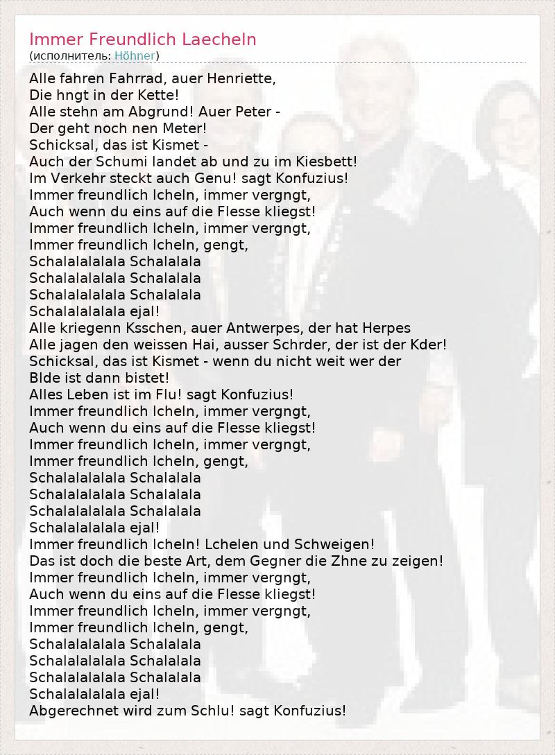 Alle fahren Fahrrad, auer Henriette, Die hngt in der Kette! Alle stehn am Abgrund! Auer Peter - Der geht noch nen Meter! Schicksal, das ist Kismet - Auch der Schumi landet ab und zu im Kiesbett! Im Verkehr steckt auch Genu! sagt Konfuzius! Immer freundlich lcheln, immer vergngt, Auch wenn du eins auf die Flesse kliegst! Immer freundlich lcheln, immer vergngt, Immer freundlich lcheln, gengt, Schalalalalala Schalalala Schalalalalala Schalalala Schalalalalala Schalalala Schalalalalala ejal! Alle kriegenn Ksschen, auer Antwerpes, der hat Herpes Alle jagen den weissen Hai, ausser Schrder, der ist der Kder! Schicksal, das ist Kismet - wenn du nicht weit wer der Blde ist dann bistet! Alles Leben ist im Flu! sagt Konfuzius! Immer freundlich lcheln, immer vergngt, Auch wenn du eins auf die Flesse kliegst! Immer freundlich lcheln, immer vergngt, Immer freundlich lcheln, gengt, Schalalalalala Schalalala Schalalalalala Schalalala Schalalalalala Schalalala Schalalalalala ejal! Immer freundlich lcheln! Lchelen und Schweigen! Das ist doch die beste Art, dem Gegner die Zhne zu zeigen! Immer freundlich lcheln, immer vergngt, Auch wenn du eins auf die Flesse kliegst! Immer freundlich lcheln, immer vergngt, Immer freundlich lcheln, gengt, Schalalalalala Schalalala Schalalalalala Schalalala Schalalalalala Schalalala Schalalalalala ejal! Abgerechnet wird zum Schlu! sagt Konfuzius!