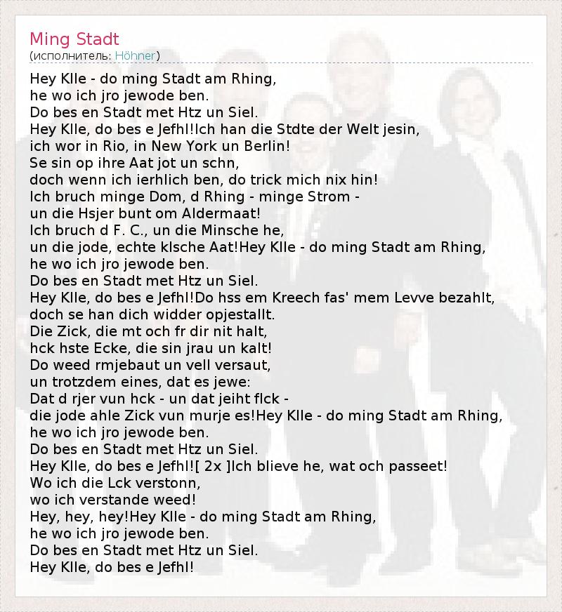 Hey Klle - do ming Stadt am Rhing, he wo ich jro jewode ben. Do bes en Stadt met Htz un Siel. Hey Klle, do bes e Jefhl!Ich han die Stdte der Welt jesin, ich wor in Rio, in New York un Berlin! Se sin op ihre Aat jot un schn, doch wenn ich ierhlich ben, do trick mich nix hin! Ich bruch minge Dom, d Rhing - minge Strom - un die Hsjer bunt om Aldermaat! Ich bruch d F. C., un die Minsche he, un die jode, echte klsche Aat!Hey Klle - do ming Stadt am Rhing, he wo ich jro jewode ben. Do bes en Stadt met Htz un Siel. Hey Klle, do bes e Jefhl!Do hss em Kreech fas' mem Levve bezahlt, doch se han dich widder opjestallt. Die Zick, die mt och fr dir nit halt, hck hste Ecke, die sin jrau un kalt! Do weed rmjebaut un vell versaut, un trotzdem eines, dat es jewe: Dat d rjer vun hck - un dat jeiht flck - die jode ahle Zick vun murje es!Hey Klle - do ming Stadt am Rhing, he wo ich jro jewode ben. Do bes en Stadt met Htz un Siel. Hey Klle, do bes e Jefhl![ 2x ]Ich blieve he, wat och passeet! Wo ich die Lck verstonn, wo ich verstande weed! Hey, hey, hey!Hey Klle - do ming Stadt am Rhing, he wo ich jro jewode ben. Do bes en Stadt met Htz un Siel. Hey Klle, do bes e Jefhl!