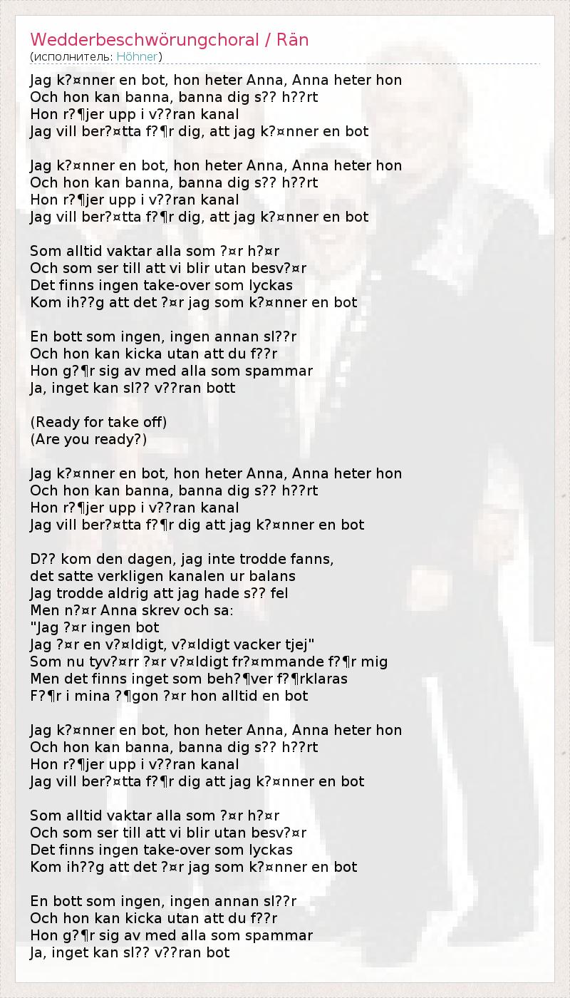 Jag k?¤nner en bot, hon heter Anna, Anna heter hon Och hon kan banna, banna dig s?? h??rt Hon r?¶jer upp i v??ran kanal Jag vill ber?¤tta f?¶r dig, att jag k?¤nner en bot Jag k?¤nner en bot, hon heter Anna, Anna heter hon Och hon kan banna, banna dig s?? h??rt Hon r?¶jer upp i v??ran kanal Jag vill ber?¤tta f?¶r dig, att jag k?¤nner en bot Som alltid vaktar alla som ?¤r h?¤r Och som ser till att vi blir utan besv?¤r Det finns ingen take-over som lyckas Kom ih??g att det ?¤r jag som k?¤nner en bot En bott som ingen, ingen annan sl??r Och hon kan kicka utan att du f??r Hon g?¶r sig av med alla som spammar Ja, inget kan sl?? v??ran bott (Ready for take off) (Are you ready?) Jag k?¤nner en bot, hon heter Anna, Anna heter hon Och hon kan banna, banna dig s?? h??rt Hon r?¶jer upp i v??ran kanal Jag vill ber?¤tta f?¶r dig att jag k?¤nner en bot D?? kom den dagen, jag inte trodde fanns, det satte verkligen kanalen ur balans Jag trodde aldrig att jag hade s?? fel Men n?¤r Anna skrev och sa: "Jag ?¤r ingen bot Jag ?¤r en v?¤ldigt, v?¤ldigt vacker tjej" Som nu tyv?¤rr ?¤r v?¤ldigt fr?¤mmande f?¶r mig Men det finns inget som beh?¶ver f?¶rklaras F?¶r i mina ?¶gon ?¤r hon alltid en bot Jag k?¤nner en bot, hon heter Anna, Anna heter hon Och hon kan banna, banna dig s?? h??rt Hon r?¶jer upp i v??ran kanal Jag vill ber?¤tta f?¶r dig att jag k?¤nner en bot Som alltid vaktar alla som ?¤r h?¤r Och som ser till att vi blir utan besv?¤r Det finns ingen take-over som lyckas Kom ih??g att det ?¤r jag som k?¤nner en bot En bott som ingen, ingen annan sl??r Och hon kan kicka utan att du f??r Hon g?¶r sig av med alla som spammar Ja, inget kan sl?? v??ran bot