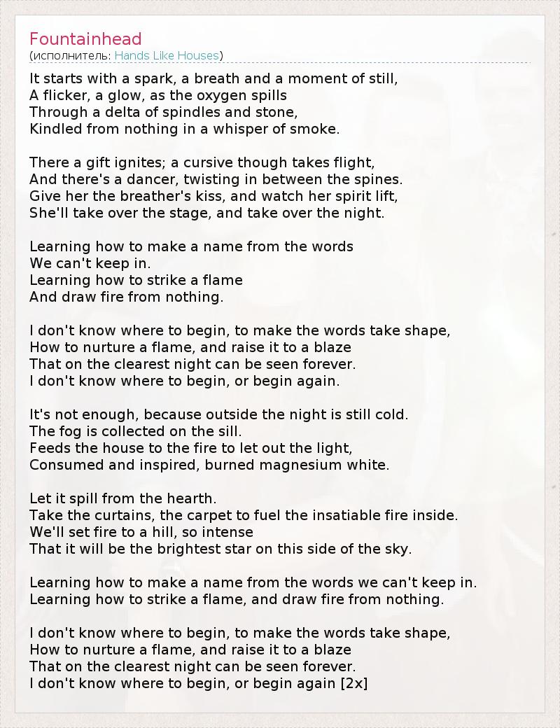 Все началось с искры, дуновения ветра и мгновенного затишья, Вспышка, отблеск, пока кислород растекается Сквозь дельту веретен и камней, Разгорелось из ничего с одного дымного вздоха. Там зарождается дар, И появляется танцор, танцующий твист между гребнями горы. Подари ей лишающий дыхания поцелуй и смотри, как взлетает ее дух, Она выйдет на сцену и вольется в ночь. Я учусь составлять названия из слов, Которые мы не можем запомнить. Я учусь разжигать пламя И добывать огонь из ничего. Я не знаю, с чего начать, чтобы заставить слова обрести форму, Как вскормить огонь и заставить его пылать ярко, Чтобы самая ясная ночь была такой всегда. Я не знаю, с чего начать, или начать все заново. Этого не достаточно, потому что ночь за окном все еще холодная. Туман сгустился у порога, Он наполняет дом чтобы огонь выпустил на волю свет, Истощенный и вдохновленный, выжженный до цвета магния. Дай ему выплеснуться из сердца, Возьми занавески, ковер, чтобы разжечь этот ненасытный огонь внутри. Мы подожжем холм с такой силой, Что это будет самая яркая звезда на этой стороне неба. Я учусь составлять названия из слов, которые мы не можем запомнить. Я учусь разжигать пламя и добывать огонь из ничего. Я не знаю, с чего начать, чтобы заставить слова обрести форму, Как вскормить огонь и заставить его пылать ярко, Чтобы самая ясная ночь была такой всегда. Я не знаю, с чего начать, или начать все заново [2x]