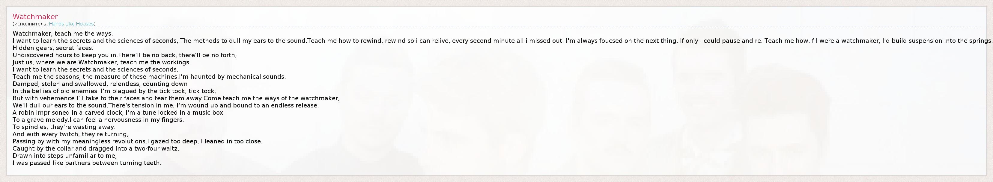 Watchmaker, teach me the ways. I want to learn the secrets and the sciences of seconds, The methods to dull my ears to the sound.Teach me how to rewind, rewind so i can relive, every second minute all i missed out. I'm always foucsed on the next thing. If only I could pause and re. Teach me how.If I were a watchmaker, I'd build suspension into the springs. Hidden gears, secret faces. Undiscovered hours to keep you in.There'll be no back, there'll be no forth, Just us, where we are.Watchmaker, teach me the workings. I want to learn the secrets and the sciences of seconds. Teach me the seasons, the measure of these machines.I'm haunted by mechanical sounds. Damped, stolen and swallowed, relentless, counting down In the bellies of old enemies. I'm plagued by the tick tock, tick tock, But with vehemence I'll take to their faces and tear them away.Come teach me the ways of the watchmaker, We'll dull our ears to the sound.There's tension in me, I'm wound up and bound to an endless release. A robin imprisoned in a carved clock, I'm a tune locked in a music box To a grave melody.I can feel a nervousness in my fingers. To spindles, they're wasting away. And with every twitch, they're turning, Passing by with my meaningless revolutions.I gazed too deep, I leaned in too close. Caught by the collar and dragged into a two-four waltz. Drawn into steps unfamiliar to me, I was passed like partners between turning teeth.