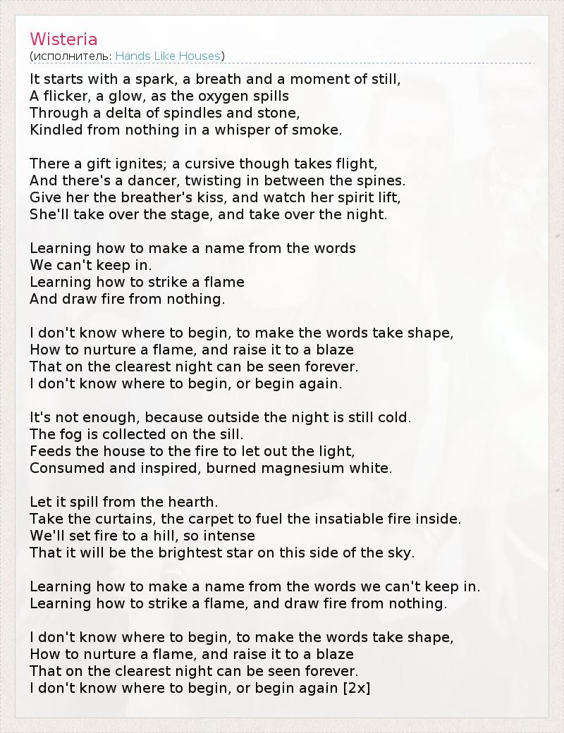 Все началось с искры, дуновения ветра и мгновенного затишья, Вспышка, отблеск, пока кислород растекается Сквозь дельту веретен и камней, Разгорелось из ничего с одного дымного вздоха. Там зарождается дар, И появляется танцор, танцующий твист между гребнями горы. Подари ей лишающий дыхания поцелуй и смотри, как взлетает ее дух, Она выйдет на сцену и вольется в ночь. Я учусь составлять названия из слов, Которые мы не можем запомнить. Я учусь разжигать пламя И добывать огонь из ничего. Я не знаю, с чего начать, чтобы заставить слова обрести форму, Как вскормить огонь и заставить его пылать ярко, Чтобы самая ясная ночь была такой всегда. Я не знаю, с чего начать, или начать все заново. Этого не достаточно, потому что ночь за окном все еще холодная. Туман сгустился у порога, Он наполняет дом чтобы огонь выпустил на волю свет, Истощенный и вдохновленный, выжженный до цвета магния. Дай ему выплеснуться из сердца, Возьми занавески, ковер, чтобы разжечь этот ненасытный огонь внутри. Мы подожжем холм с такой силой, Что это будет самая яркая звезда на этой стороне неба. Я учусь составлять названия из слов, которые мы не можем запомнить. Я учусь разжигать пламя и добывать огонь из ничего. Я не знаю, с чего начать, чтобы заставить слова обрести форму, Как вскормить огонь и заставить его пылать ярко, Чтобы самая ясная ночь была такой всегда. Я не знаю, с чего начать, или начать все заново [2x]