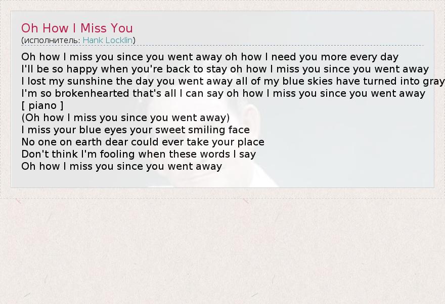 Oh how I miss you since you went away oh how I need you more every day I'll be so happy when you're back to stay oh how I miss you since you went away I lost my sunshine the day you went away all of my blue skies have turned into gray I'm so brokenhearted that's all I can say oh how I miss you since you went away [ piano ] (Oh how I miss you since you went away) I miss your blue eyes your sweet smiling face No one on earth dear could ever take your place Don't think I'm fooling when these words I say Oh how I miss you since you went away