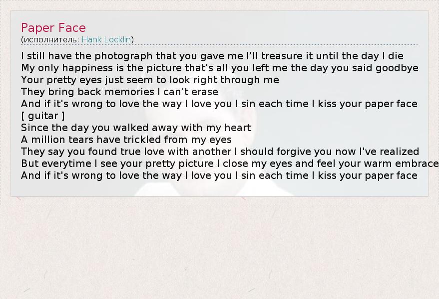 I still have the photograph that you gave me I'll treasure it until the day I die My only happiness is the picture that's all you left me the day you said goodbye Your pretty eyes just seem to look right through me They bring back memories I can't erase And if it's wrong to love the way I love you I sin each time I kiss your paper face [ guitar ] Since the day you walked away with my heart A million tears have trickled from my eyes They say you found true love with another I should forgive you now I've realized But everytime I see your pretty picture I close my eyes and feel your warm embrace And if it's wrong to love the way I love you I sin each time I kiss your paper face