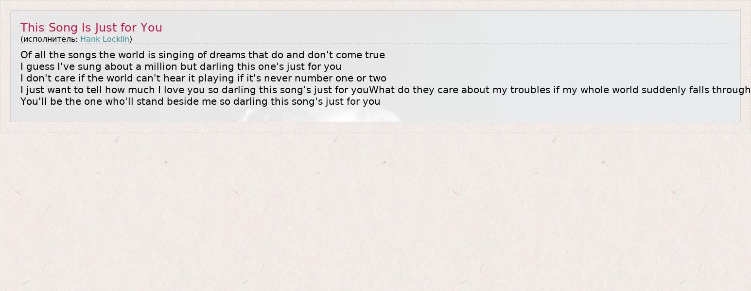 Of all the songs the world is singing of dreams that do and don't come true I guess I've sung about a million but darling this one's just for you I don't care if the world can't hear it playing if it's never number one or two I just want to tell how much I love you so darling this song's just for youWhat do they care about my troubles if my whole world suddenly falls through You'll be the one who'll stand beside me so darling this song's just for you