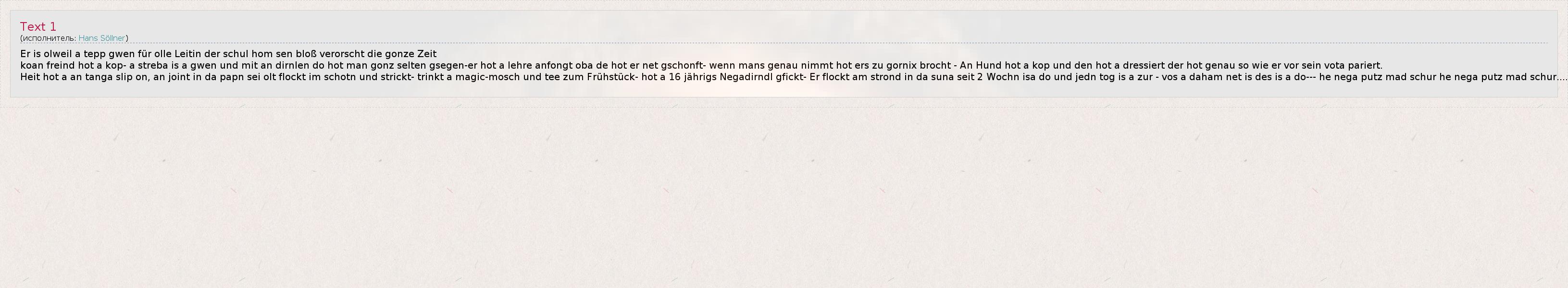 koan freind hot a kop- a streba is a gwen und mit an dirnlen do hot man gonz selten gsegen-er hot a lehre anfongt oba de hot er net gschonft- wenn mans genau nimmt hot ers zu gornix brocht - An Hund hot a kop und den hot a dressiert der hot genau so wie er vor sein vota pariert.