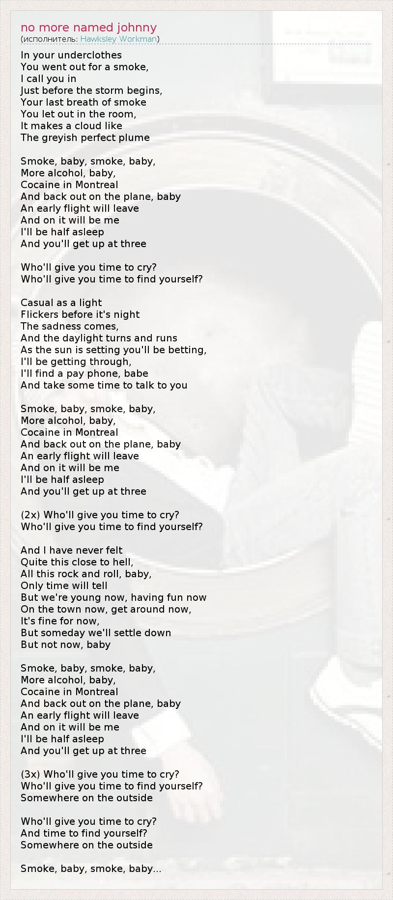 In your underclothes You went out for a smoke, I call you in Just before the storm begins, Your last breath of smoke You let out in the room, It makes a cloud like The greyish perfect plume Smoke, baby, smoke, baby, More alcohol, baby, Cocaine in Montreal And back out on the plane, baby An early flight will leave And on it will be me I'll be half asleep And you'll get up at three Who'll give you time to cry? Who'll give you time to find yourself? Casual as a light Flickers before it's night The sadness comes, And the daylight turns and runs As the sun is setting you'll be betting, I'll be getting through, I'll find a pay phone, babe And take some time to talk to you Smoke, baby, smoke, baby, More alcohol, baby, Cocaine in Montreal And back out on the plane, baby An early flight will leave And on it will be me I'll be half asleep And you'll get up at three (2x) Who'll give you time to cry? Who'll give you time to find yourself? And I have never felt Quite this close to hell, All this rock and roll, baby, Only time will tell But we're young now, having fun now On the town now, get around now, It's fine for now, But someday we'll settle down But not now, baby Smoke, baby, smoke, baby, More alcohol, baby, Cocaine in Montreal And back out on the plane, baby An early flight will leave And on it will be me I'll be half asleep And you'll get up at three (3x) Who'll give you time to cry? Who'll give you time to find yourself? Somewhere on the outside Who'll give you time to cry? And time to find yourself? Somewhere on the outside Smoke, baby, smoke, baby...