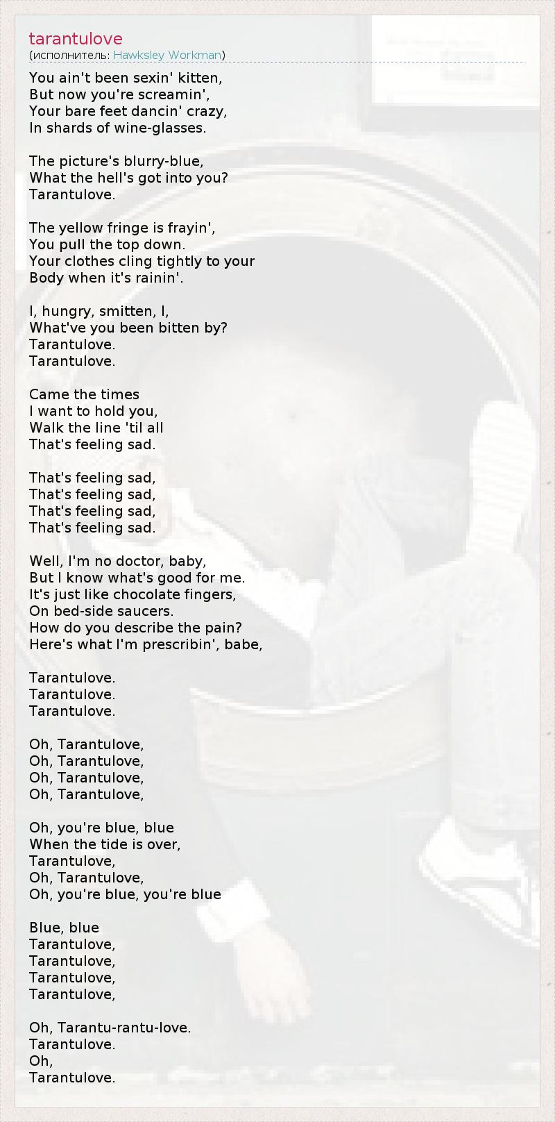 You ain't been sexin' kitten, But now you're screamin', Your bare feet dancin' crazy, In shards of wine-glasses. The picture's blurry-blue, What the hell's got into you? Tarantulove. The yellow fringe is frayin', You pull the top down. Your clothes cling tightly to your Body when it's rainin'. I, hungry, smitten, I, What've you been bitten by? Tarantulove. Tarantulove. Came the times I want to hold you, Walk the line 'til all That's feeling sad. That's feeling sad, That's feeling sad, That's feeling sad, That's feeling sad. Well, I'm no doctor, baby, But I know what's good for me. It's just like chocolate fingers, On bed-side saucers. How do you describe the pain? Here's what I'm prescribin', babe, Tarantulove. Tarantulove. Tarantulove. Oh, Tarantulove, Oh, Tarantulove, Oh, Tarantulove, Oh, Tarantulove, Oh, you're blue, blue When the tide is over, Tarantulove, Oh, Tarantulove, Oh, you're blue, you're blue Blue, blue Tarantulove, Tarantulove, Tarantulove, Tarantulove, Oh, Tarantu-rantu-love. Tarantulove. Oh, Tarantulove.