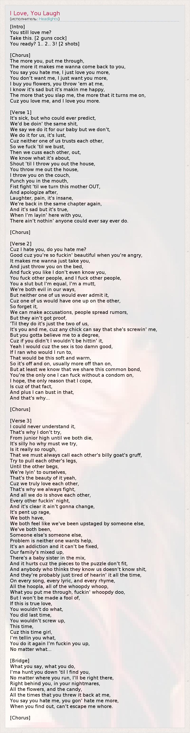 [Пролог:] Ты всё ещё любишь меня? Возьми вот это [взвод курков двух ружей] Ты готова? На счёт раз, два, три! [2 выстрела] [Припев:] Чем больше я из-за тебя страдаю, Тем сильнее мне хочется возвращаться к тебе. Ты говоришь, что ненавидишь меня, а я начинаю любить тебя сильнее. Ты не хочешь меня, но это лишь распаляет моё желание. Я покупаю цветы, а ты бросаешь их мне в лицо. Знаю, это печально, но это делает меня счастливым. Чем сильнее ты меня бьёшь, тем больше это меня заводит, Потому что ты любишь меня, а я - тебя. [1-ый куплет:] Это ненормально, но кто мог заранее знать, Что мы будем заниматься одним и тем же. Мы говорим, что делаем это, чтобы завести ребёнка, но это не так, Мы делаем это ради себя, это похоть, Потому что мы не доверяем друг другу И просто тра*аемся до потери пульса. Затем мы кроем друг друга матом, Мы знаем для чего это: Кричи, пока я не вышвырну тебя из дома. Ты вышвыриваешь меня за порог, А я бросаю тебя на кровать И бью кулаком в лицо. Кулачный бой продолжается, пока я не выбью из тебя дурь, А потом – извинения, Смех, боль – это настоящее безумие, Но мы возвращаемся к тому, с чего начали. Это печально, но это правда: Когда я лежу рядом с тобой, Никто и ничто не в силе встать между нами. [Припев:] [2-ой куплет:] Я ненавижу тебя, а ты меня ненавидишь? Отлично, потому что ты чертовски прекрасна в гневе, В эти мгновения мне хочется взять тебя силой, Просто бросить на кровать И тра*ать, как будто я тебя даже не знаю. Ты спишь с другими мужиками, и у меня баб не меньше, Ты шлю*а, но я тебе не уступаю, я болван. Мы порочны – каждый по-своему, Но мы никогда не признаемся в этом, Потому что в этом случае один из нас одержит верх над другим, Поэтому забудь об этом. Мы можем обвинять друг друга, об этом даже ходят слухи, Но ни у кого нет доказательств, Потому что правду знаем только мы вдвоём, Ты и я. Любая тёлка может сказать, что она спит со мной, Но ты должна мне верить хоть в некоторой степени, Ведь если бы это было не так, то я бы этого не говорил. Ну, ладно, я вру, но секс – это чертовски приятно. Если бы мне пришлось убежать, к кому бы я прибился? К чему-то мягкому и тёплому. Это случается время от времени, скорее редко, чем часто, Но, по крайней мере, мы знаем, что нас связывает эта нить. Ты единственная, кого я могу тра*ать без резинки. Пожалуй, это единственная причина, По которой я по-прежнему с тобой. Да, плюс к этому я могу туда кончить, И поэтому… [Припев:] [3-ий куплет:] Я никогда этого не понимал, И даже не пытаюсь понять – С 5 класса и пока смерть не разлучит нас. Это так глупо! Зачем даже пробовать? Неужели это настолько неприлично, Что вынуждает нас грубо обращаться с нашими половинками? Мы вешаем друг другу лапшу на уши, Пока один из нас не взмолится, Мы врём и себе, Но в этом-то и вся прелесть! Потому что мы искренне любим друг друга, Именно поэтому мы постоянно дерёмся, Пихаемся и толкаемся Каждую чёртову ночь. Ясно, что ничего не изменится, Здесь речь идёт о накопившейся злости У обоих. Мы оба чувствуем, словно нас отодвинули на второй план, Ведь раньше мы оба были Кем-то для кого-то. Проблема в том, что ни один из нас не нуждается в помощи другого. Это уже зависимость, от которой нам не избавиться. В это уже замешана вся семья, Даже маленькая сестричка. Это причиняет боль, потому что ничего не сходится. Те, кто думает, что знает нас, на самом деле ни черта не знают, Возможно, они уже прост