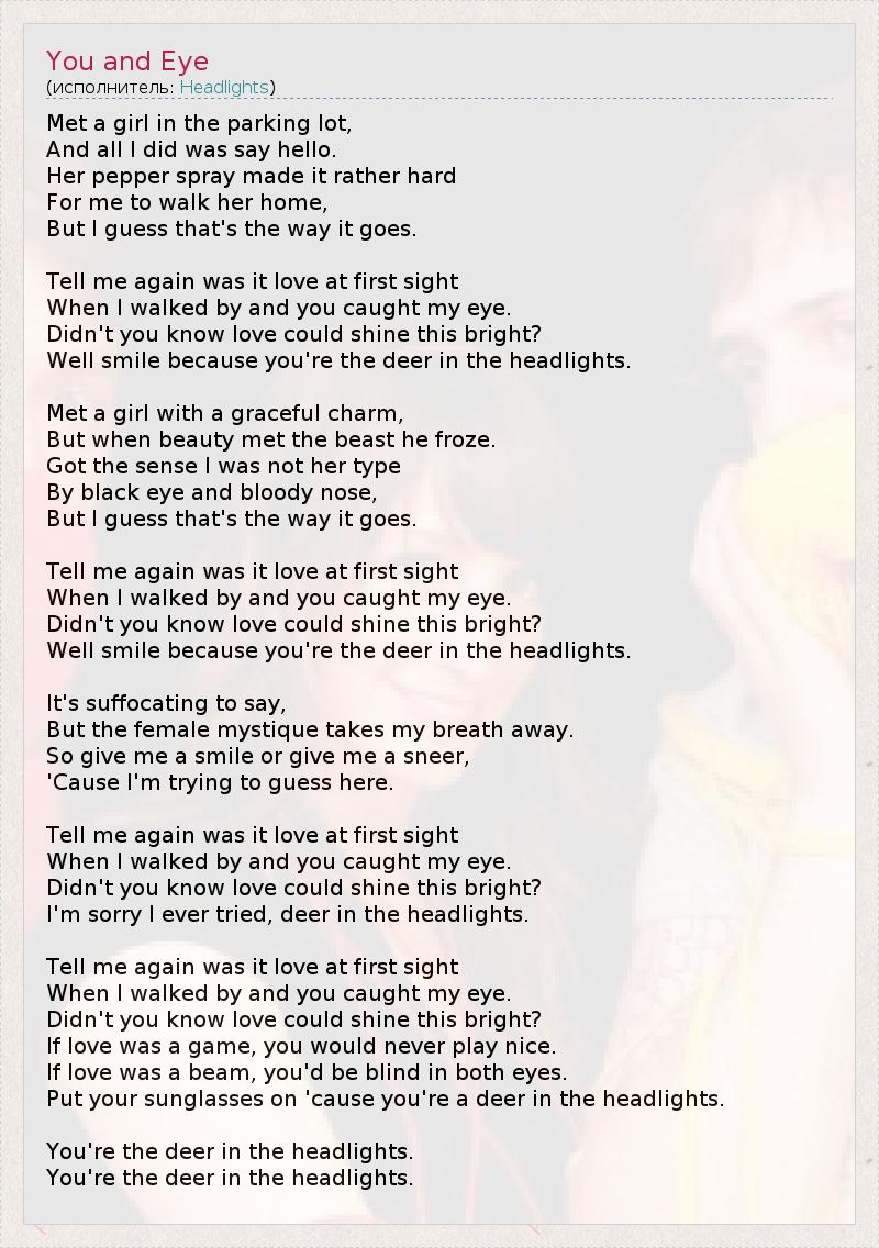 Встретил девушку на парковке, Я только поздоровался, и больше ничего. Её газовый баллончик не дал Мне проводить её домой, Но, я думаю, так и должно быть. Скажи мне еще раз, была ли это любовь с первого взгляда, Когда я проходил мимо, а ты привлекла моё внимание... Знала ли ты, что любовь может сиять так ярко? Ладно, улыбнись, ведь ты - лань в свете фар. Встретил очаровательную девушку, Но когда красавица встретила чудовище, он застыл. Появилось чувство, что я не для неё, С синяком и кровоточащим носом, Но, я думаю, так и должно быть. Скажи мне еще раз, была ли это любовь с первого взгляда, Когда я проходил мимо, а ты привлекла моё внимание... Знала ли ты, что любовь может сиять так ярко? Ладно, улыбнись, ведь ты - лань в свете фар. Это трудно сказать, Но от женской привлекательности у меня захватывает дух... Улыбнись мне или высмей меня, Потому что я не знаю, чего ждать. Скажи мне еще раз, была ли это любовь с первого взгляда, Когда я проходил мимо, а ты привлекла моё внимание... Знала ли ты, что любовь может сиять так ярко? Прости за то, что я вообще пытался, лань в свете фар. Скажи мне еще раз, была ли это любовь с первого взгляда, Когда я проходил мимо, а ты привлекла моё внимание... Знала ли ты, что любовь может сиять так ярко? Если бы любовь была игрой, ты бы никогда не была хорошим игроком, Если бы любовь была лучами света, ты была бы слепа на оба глаза. Надень свои очки, потому что ты - лань в свете фар... Ты - лань в свете фар, Ты - лань в свете фар...