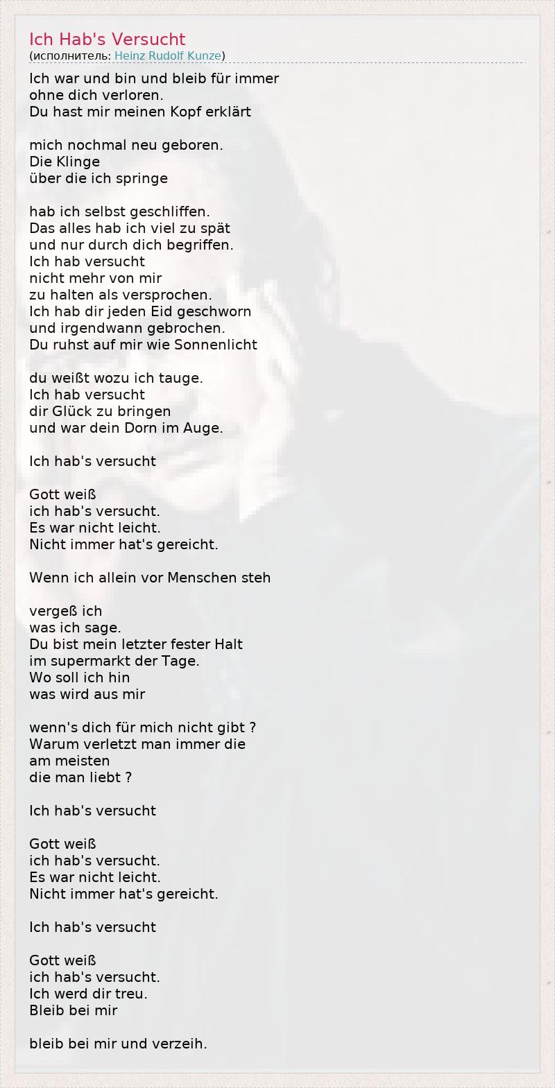 Ich war und bin und bleib für immer ohne dich verloren. Du hast mir meinen Kopf erklärt mich nochmal neu geboren. Die Klinge über die ich springe hab ich selbst geschliffen. Das alles hab ich viel zu spät und nur durch dich begriffen. Ich hab versucht nicht mehr von mir zu halten als versprochen. Ich hab dir jeden Eid geschworn und irgendwann gebrochen. Du ruhst auf mir wie Sonnenlicht du weißt wozu ich tauge. Ich hab versucht dir Glück zu bringen und war dein Dorn im Auge. Ich hab's versucht Gott weiß ich hab's versucht. Es war nicht leicht. Nicht immer hat's gereicht. Wenn ich allein vor Menschen steh vergeß ich was ich sage. Du bist mein letzter fester Halt im supermarkt der Tage. Wo soll ich hin was wird aus mir wenn's dich für mich nicht gibt ? Warum verletzt man immer die am meisten die man liebt ? Ich hab's versucht Gott weiß ich hab's versucht. Es war nicht leicht. Nicht immer hat's gereicht. Ich hab's versucht Gott weiß ich hab's versucht. Ich werd dir treu. Bleib bei mir bleib bei mir und verzeih.