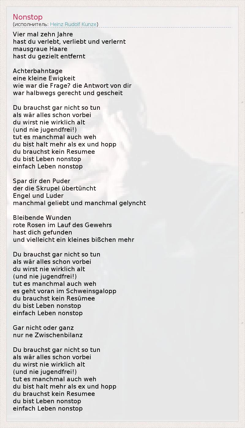 Vier mal zehn Jahre hast du verlebt, verliebt und verlernt mausgraue Haare hast du gezielt entfernt Achterbahntage eine kleine Ewigkeit wie war die Frage? die Antwort von dir war halbwegs gerecht und gescheit Du brauchst gar nicht so tun als wär alles schon vorbei du wirst nie wirklich alt (und nie jugendfrei!) tut es manchmal auch weh du bist halt mehr als ex und hopp du brauchst kein Resumee du bist Leben nonstop einfach Leben nonstop Spar dir den Puder der die Skrupel übertüncht Engel und Luder manchmal geliebt und manchmal gelyncht Bleibende Wunden rote Rosen im Lauf des Gewehrs hast dich gefunden und vielleicht ein kleines bißchen mehr Du brauchst gar nicht so tun als wär alles schon vorbei du wirst nie wirklich alt (und nie jugendfrei!) tut es manchmal auch weh es geht voran im Schweinsgalopp du brauchst kein Resümee du bist Leben nonstop einfach Leben nonstop Gar nicht oder ganz nur ne Zwischenbilanz Du brauchst gar nicht so tun als wär alles schon vorbei du wirst nie wirklich alt (und nie jugendfrei!) tut es manchmal auch weh du bist halt mehr als ex und hopp du brauchst kein Resumee du bist Leben nonstop einfach Leben nonstop