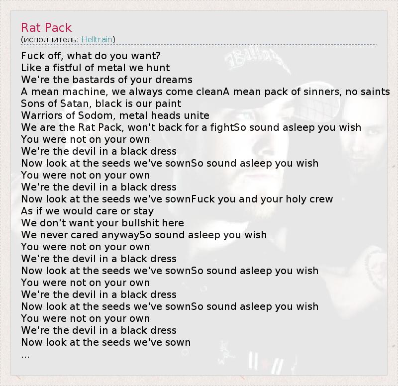 Fuck off, what do you want? Like a fistful of metal we hunt We're the bastards of your dreams A mean machine, we always come cleanA mean pack of sinners, no saints Sons of Satan, black is our paint Warriors of Sodom, metal heads unite We are the Rat Pack, won't back for a fightSo sound asleep you wish You were not on your own We're the devil in a black dress Now look at the seeds we've sownSo sound asleep you wish You were not on your own We're the devil in a black dress Now look at the seeds we've sownFuck you and your holy crew As if we would care or stay We don't want your bullshit here We never cared anywaySo sound asleep you wish You were not on your own We're the devil in a black dress Now look at the seeds we've sownSo sound asleep you wish You were not on your own We're the devil in a black dress Now look at the seeds we've sownSo sound asleep you wish You were not on your own We're the devil in a black dress Now look at the seeds we've sown ...