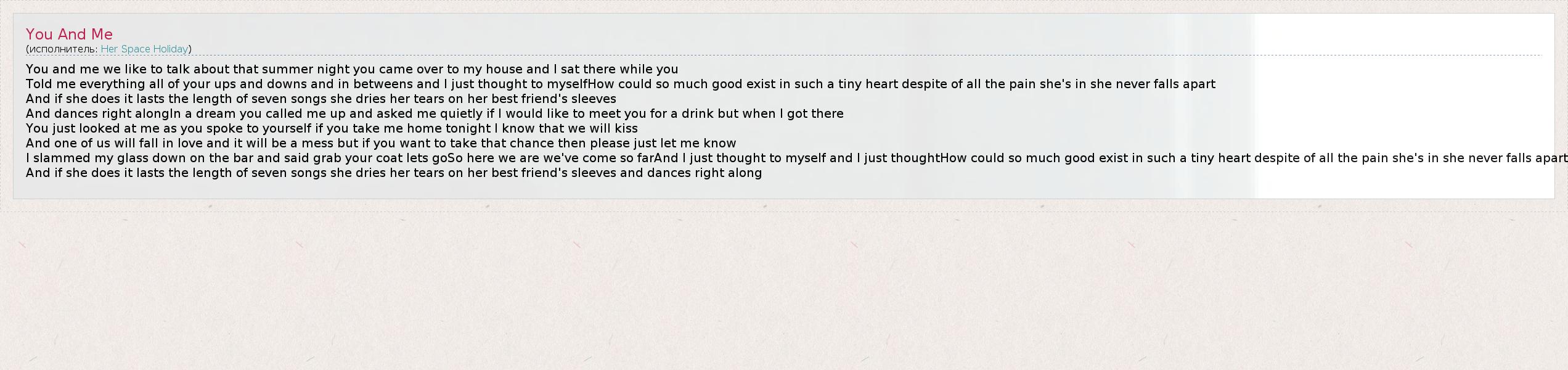Это интересно:By Mekino. Her Space Holiday – детище Марка Бианчи (Marc Bianchi), калифорнийца с весьма необычным взглядом на музыку. Родился он в Сан-Франциско, США, рос ребенком музыкальным и любознательным. Как и многие начинающие музыканты, увлекся тяжелой музыкой и первый музыкальный опыт в начале 90-х получил в hardcore группах Indian Summer, Calm и Mohinder. После нескольких лет, проведенных в этой безумной рок среде, Марк решает... продолжение