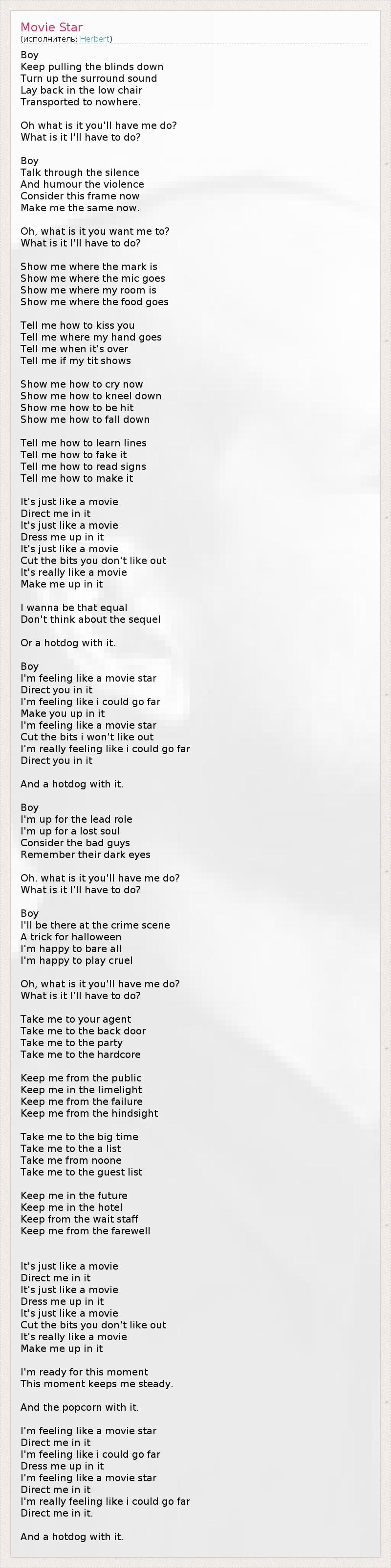Boy Keep pulling the blinds down Turn up the surround sound Lay back in the low chair Transported to nowhere. Oh what is it you'll have me do? What is it I'll have to do? Boy Talk through the silence And humour the violence Consider this frame now Make me the same now. Oh, what is it you want me to? What is it I'll have to do? Show me where the mark is Show me where the mic goes Show me where my room is Show me where the food goes Tell me how to kiss you Tell me where my hand goes Tell me when it's over Tell me if my tit shows Show me how to cry now Show me how to kneel down Show me how to be hit Show me how to fall down Tell me how to learn lines Tell me how to fake it Tell me how to read signs Tell me how to make it It's just like a movie Direct me in it It's just like a movie Dress me up in it It's just like a movie Cut the bits you don't like out It's really like a movie Make me up in it I wanna be that equal Don't think about the sequel Or a hotdog with it. Boy I'm feeling like a movie star Direct you in it I'm feeling like i could go far Make you up in it I'm feeling like a movie star Cut the bits i won't like out I'm really feeling like i could go far Direct you in it And a hotdog with it. Boy I'm up for the lead role I'm up for a lost soul Consider the bad guys Remember their dark eyes Oh. what is it you'll have me do? What is it I'll have to do? Boy I'll be there at the crime scene A trick for halloween I'm happy to bare all I'm happy to play cruel Oh, what is it you'll have me do? What is it I'll have to do? Take me to your agent Take me to the back door Take me to the party Take me to the hardcore Keep me from the public Keep me in the limelight Keep me from the failure Keep me from the hindsight Take me to the big time Take me to the a list Take me from noone Take me to the guest list Keep me in the future Keep me in the hotel Keep from the wait staff Keep me from the farewell It's just like a movie Direct me in it It's just like a movie Dress me up in it It's just like a movie Cut the bits you don't like out It's really like a movie Make me up in it I'm ready for this moment This moment keeps me steady. And the popcorn with it. I'm feeling like a movie star Direct me in it I'm feeling like i could go far Dress me up in it I'm feeling like a movie star Direct me in it I'm really feeling like i could go far Direct me in it. And a hotdog with it.