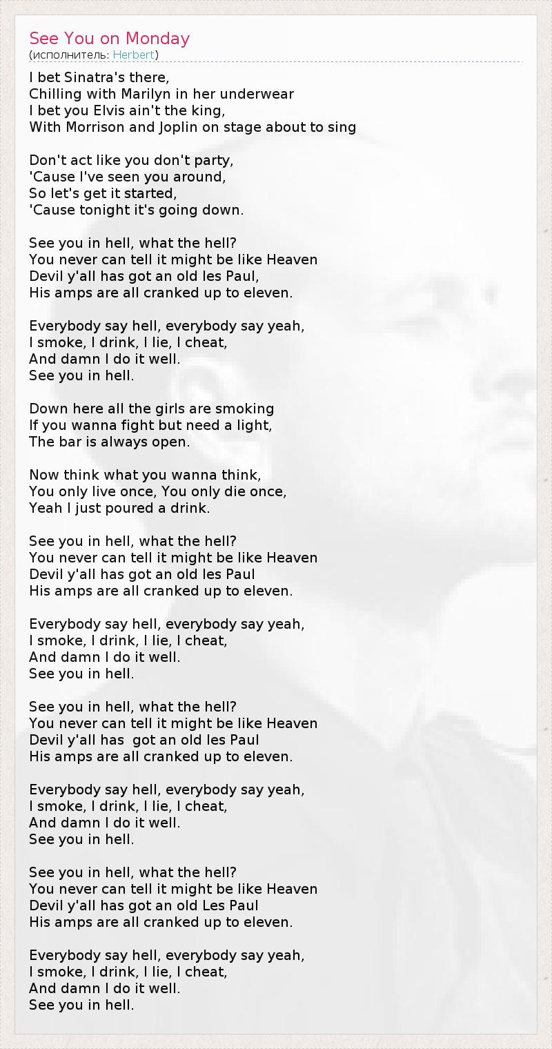 Держу пари - Синатра там Расслабляется с Мэрилин в нижнем белье. Держу пари - Элвис не король, Они вместе с Моррисоном и Джоплином на сцене вот-вот начнут петь. Не делай вид, что тебе не весело, Ведь я тебя уже встречал. Так давайте же начнем, Ведь сегодня вечером всё случится. Увидимся в аду. Какого чёрта?! Может быть, ад похож на Рай, ты никогда не сможешь точно сказать. У дьявола есть старая Лес Пол, 1 И все его усилители поставлены на 11. 2 Все говорят: "Ад", все говорят: "О да!". Я курю, я пью, я лгу, я мошенничаю И, чёрт побери, я хорош в этом. Увидимся в аду! Здесь внизу все девушки курят, Если ты хочешь бороться, но тебе нужно светлое - 3 Бар всегда открыт. Теперь думай, что хочешь, Ты живешь только один раз, О да, я уже разлил напитки. Увидимся в аду. Какого чёрта?! Может быть, ад похож на Рай, ты никогда не сможешь точно сказать. У дьявола есть старая Лес Пол, И все его усилители поставлены на 11. Все говорят: "Ад", все говорят: "О да!". Я курю, я пью, я лгу, я мошенничаю И, чёрт побери, я хорош в этом. Увидимся в аду! Увидимся в аду. Какого чёрта?! Может быть, ад похож на Рай, ты никогда не сможешь точно сказать. У дьявола есть старая Лес Пол, И все его усилители поставлены на 11. Все говорят: "Ад", все говорят: "О да!". Я курю, я пью, я лгу, я мошенничаю И, чёрт побери, я хорош в этом. Увидимся в аду! Увидимся в аду. Какого чёрта?! Может быть, ад похож на Рай, ты никогда не сможешь точно сказать. У дьявола есть старая Лес Пол, И все его усилители поставлены на 11. Все говорят: "Ад", все говорят: "О да!". Я курю, я пью, я лгу, я мошенничаю И, чёрт побери, я хорош в этом. Увидимся в аду! 1 - Лес Пол - гитарист, который изобрел первую электрогитару, которая называлась Gibson Les Paul. Конкретно в данном случае речь идёт о гитаре. 2 - Выражение пошло из фильма "Это — Spinal Tap", в котором у гитариста Найджела Тафнелла был усилитель звука со шкалой громкости от 1 до 11, тогда как обычно у всех усилителей эта шкала располагается на значениях от 1 до 10. Таким образом, выражение означает "Звук на максимум" или "звук на 110 %". 3 - У слова light несколько значений, в частности: 1) свет, 2) light beer - лагер, светлое пиво. Упоминание бара в следующей строке дает понять, что речь идёт о пиве.