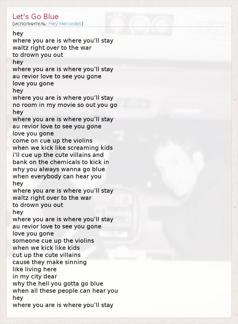 hey where you are is where you'll stay waltz right over to the war to drown you out hey where you are is where you'll stay au revior love to see you gone love you gone hey where you are is where you'll stay no room in my movie so out you go hey where you are is where you'll stay au revior love to see you gone love you gone come on cue up the violins when we kick like screaming kids i'll cue up the cute villains and bank on the chemicals to kick in why you always wanna go blue when everybody can hear you hey where you are is where you'll stay waltz right over to the war to drown you out hey where you are is where you'll stay au revior love to see you gone love you gone someone cue up the violins when we kick like kids cut up the cute villains cause they make sinning like living here in my city dear why the hell you gotta go blue when all these people can hear you hey where you are is where you'll stay