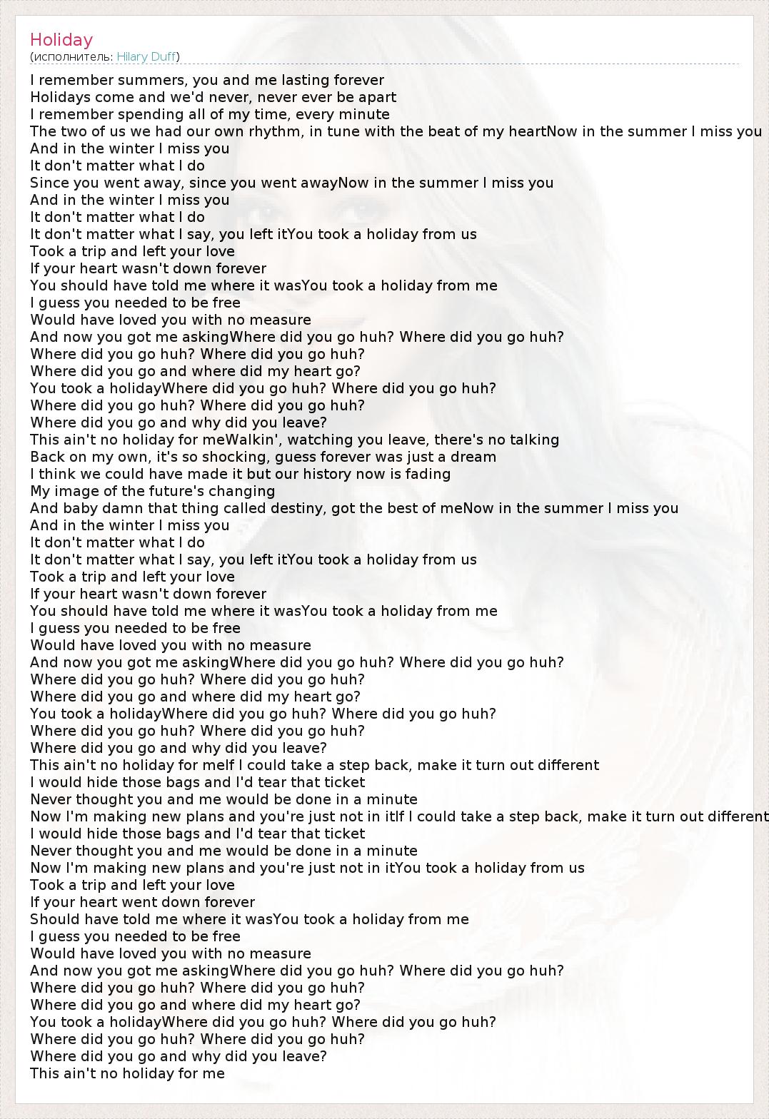I remember summers, you and me lasting forever Holidays come and we'd never, never ever be apart I remember spending all of my time, every minute The two of us we had our own rhythm, in tune with the beat of my heartNow in the summer I miss you And in the winter I miss you It don't matter what I do Since you went away, since you went awayNow in the summer I miss you And in the winter I miss you It don't matter what I do It don't matter what I say, you left itYou took a holiday from us Took a trip and left your love If your heart wasn't down forever You should have told me where it wasYou took a holiday from me I guess you needed to be free Would have loved you with no measure And now you got me askingWhere did you go huh? Where did you go huh? Where did you go huh? Where did you go huh? Where did you go and where did my heart go? You took a holidayWhere did you go huh? Where did you go huh? Where did you go huh? Where did you go huh? Where did you go and why did you leave? This ain't no holiday for meWalkin', watching you leave, there's no talking Back on my own, it's so shocking, guess forever was just a dream I think we could have made it but our history now is fading My image of the future's changing And baby damn that thing called destiny, got the best of meNow in the summer I miss you And in the winter I miss you It don't matter what I do It don't matter what I say, you left itYou took a holiday from us Took a trip and left your love If your heart wasn't down forever You should have told me where it wasYou took a holiday from me I guess you needed to be free Would have loved you with no measure And now you got me askingWhere did you go huh? Where did you go huh? Where did you go huh? Where did you go huh? Where did you go and where did my heart go? You took a holidayWhere did you go huh? Where did you go huh? Where did you go huh? Where did you go huh? Where did you go and why did you leave? This ain't no holiday for meIf I could take a step back, make it turn out different I would hide those bags and I'd tear that ticket Never thought you and me would be done in a minute Now I'm making new plans and you're just not in itIf I could take a step back, make it turn out different I would hide those bags and I'd tear that ticket Never thought you and me would be done in a minute Now I'm making new plans and you're just not in itYou took a holiday from us Took a trip and left your love If your heart went down forever Should have told me where it wasYou took a holiday from me I guess you needed to be free Would have loved you with no measure And now you got me askingWhere did you go huh? Where did you go huh? Where did you go huh? Where did you go huh? Where did you go and where did my heart go? You took a holidayWhere did you go huh? Where did you go huh? Where did you go huh? Where did you go huh? Where did you go and why did you leave? This ain't no holiday for me