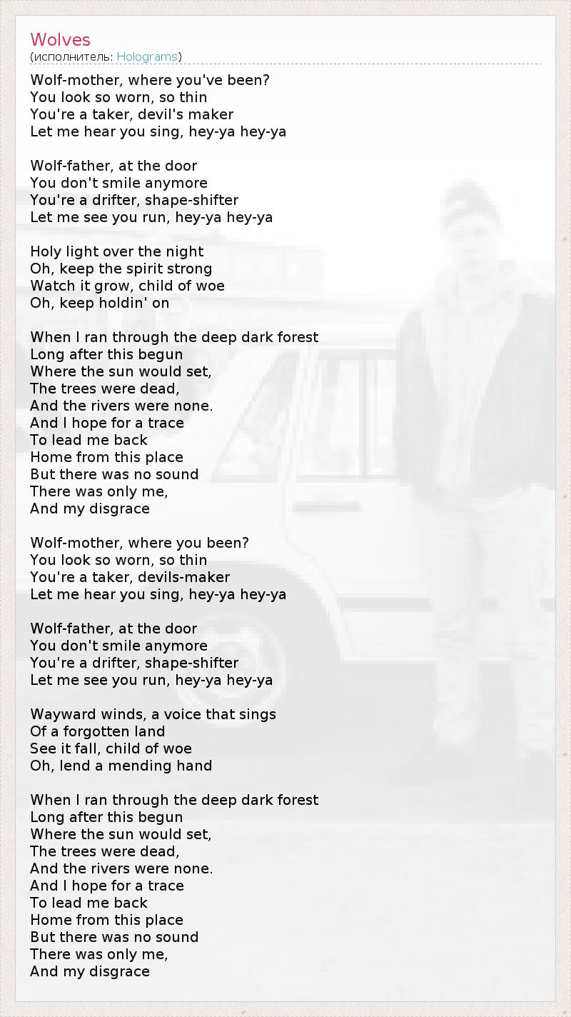 Мама-волчица, где ты была? Ты выглядишь такой изнуренной и худой. Ты охотница, порождение дьявола, Дай мне услышать твою песнь, хэй-а хэй-а Папа-волк у порога, Ты больше не улыбаешься. Ты бродяга, оборотень, Дай мне увидеть твой бег, хэй-а хэй-а Священный свет освещает ночь, Крепись духом, Смотри, как оно растет, дитя беды, Держись. Я бежала через глухой темный лес Уже после того, как это началось, Там, где солнце зашло, Деревья были мертвы, И не было рек. И я надеюсь, что тропа Приведет меня назад к дому Из этого места. Но не было слышно ни звука, Была только я И мой позор. Мама-волчица, где ты была? Ты выглядишь такой изнуренной и худой. Ты охотница, порождение дьявола, Дай мне услышать твою песнь, хэй-а хэй-а Папа-волк у порога, Ты больше не улыбаешься. Ты бродяга, оборотень, Дай мне увидеть твой бег, хэй-а хэй-а Заблудшие ветра, голос, поющий О забытой земле. Смотри, как оно падает, дитя беды, Протяни исцеляющую руку. Я бежала через глухой темный лес Уже после того, как это началось, Там, где солнце зашло, Деревья были мертвы, И не было рек. И я надеюсь, что тропа Приведет меня назад к дому Из этого места. Но не было слышно ни звука, Была только я И мой позор.
