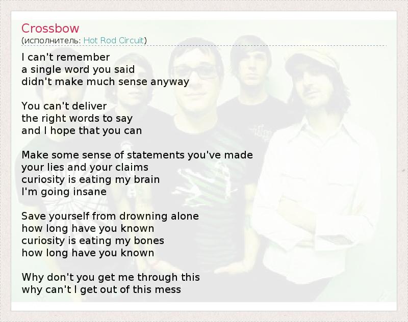 Я не помню одним словом вы сказали, не имеет смысла в любом случае Вы не можете доставить правильные слова, чтобы сказать и я надеюсь, что вы можете Сделать некотором смысле заявления вы сделали ваша ложь и ваши претензии любопытства ест мой мозг Я схожу с ума Спасите себя от утопления в одиночестве Как давно вы знакомы любопытства ест мои кости Как давно вы знакомы Почему вы не вытащите меня из этого почему я не могу выйти из этого беспорядка