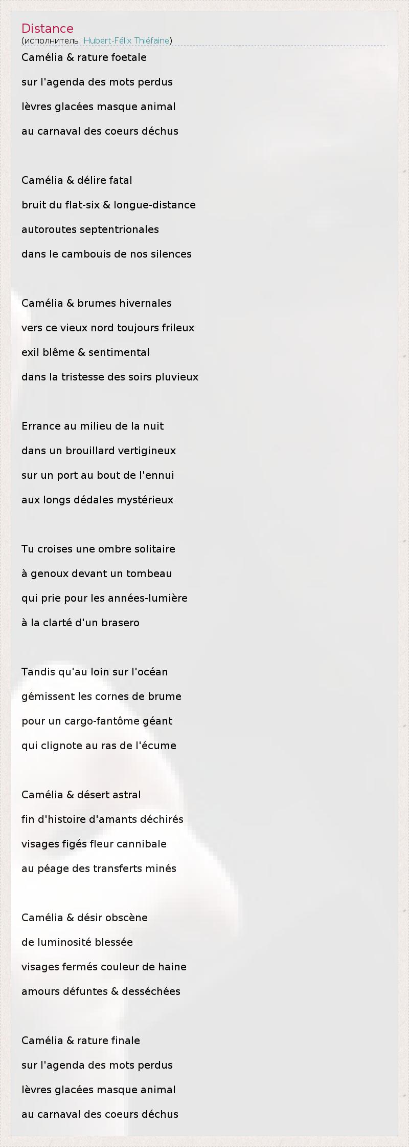 Camélia & rature foetale sur l'agenda des mots perdus lèvres glacées masque animal au carnaval des coeurs déchus Camélia & délire fatal bruit du flat-six & longue-distance autoroutes septentrionales dans le cambouis de nos silences Camélia & brumes hivernales vers ce vieux nord toujours frileux exil blême & sentimental dans la tristesse des soirs pluvieux Errance au milieu de la nuit dans un brouillard vertigineux sur un port au bout de l'ennui aux longs dédales mystérieux Tu croises une ombre solitaire à genoux devant un tombeau qui prie pour les années-lumière à la clarté d'un brasero Tandis qu'au loin sur l'océan gémissent les cornes de brume pour un cargo-fantôme géant qui clignote au ras de l'écume Camélia & désert astral fin d'histoire d'amants déchirés visages figés fleur cannibale au péage des transferts minés Camélia & désir obscène de luminosité blessée visages fermés couleur de haine amours défuntes & desséchées Camélia & rature finale sur l'agenda des mots perdus lèvres glacées masque animal au carnaval des coeurs déchus
