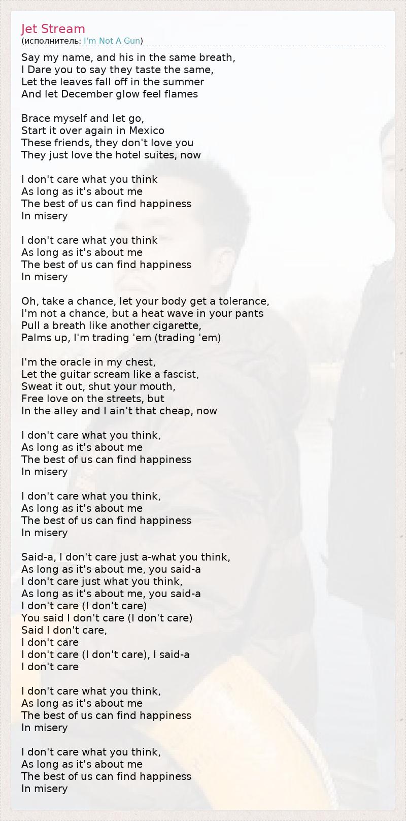 Say my name, and his in the same breath, I Dare you to say they taste the same, Let the leaves fall off in the summer And let December glow feel flames Brace myself and let go, Start it over again in Mexico These friends, they don't love you They just love the hotel suites, now I don't care what you think As long as it's about me The best of us can find happiness In misery I don't care what you think As long as it's about me The best of us can find happiness In misery Oh, take a chance, let your body get a tolerance, I'm not a chance, but a heat wave in your pants Pull a breath like another cigarette, Palms up, I'm trading 'em (trading 'em) I'm the oracle in my chest, Let the guitar scream like a fascist, Sweat it out, shut your mouth, Free love on the streets, but In the alley and I ain't that cheap, now I don't care what you think, As long as it's about me The best of us can find happiness In misery I don't care what you think, As long as it's about me The best of us can find happiness In misery Said-a, I don't care just a-what you think, As long as it's about me, you said-a I don't care just what you think, As long as it's about me, you said-a I don't care (I don't care) You said I don't care (I don't care) Said I don't care, I don't care I don't care (I don't care), I said-a I don't care I don't care what you think, As long as it's about me The best of us can find happiness In misery I don't care what you think, As long as it's about me The best of us can find happiness In misery