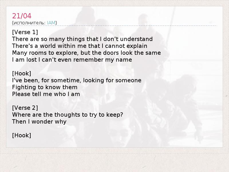 [Verse 1] There are so many things that I don't understand There's a world within me that I cannot explain Many rooms to explore, but the doors look the same I am lost I can't even remember my name [Hook] I've been, for sometime, looking for someone Fighting to know them Please tell me who I am [Verse 2] Where are the thoughts to try to keep? Then I wonder why [Hook]