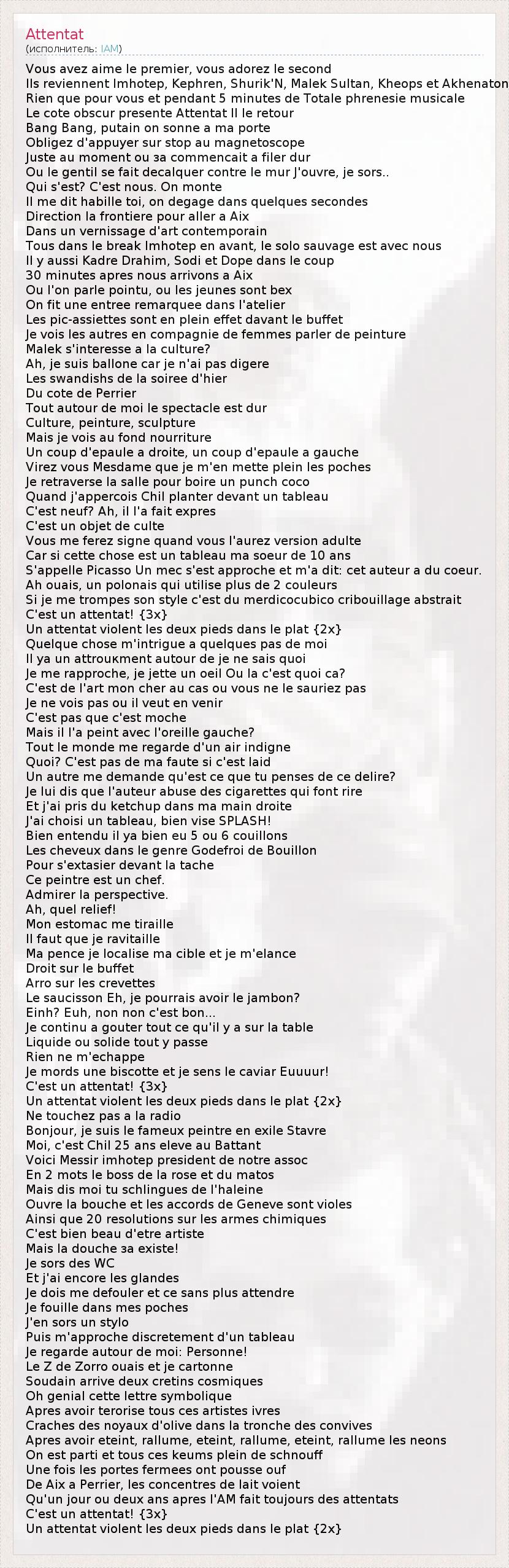 Это интересно:IAM — это французская хип-хоп-группа из Марселя, созданная в 1989 году, состоящая из Akhenaton (Philippe Fragione), Shurik'n (Geoffroy Mussard), Freeman (Malek Brahimi), Khéops (Eric Mazel), Imhotep (Pascal Perez), и Kephren (François Mendy). "IAM" имеет несколько значений, включая 'Invasion Arrivee de Mars' ('Invasion from Mars'). 'Mars' часто используется как метафора для Марселя в песнях IAM.IAM - рэп-команда из Марселя (a.k.a. Марс), впитавшая в себя особенности... продолжение