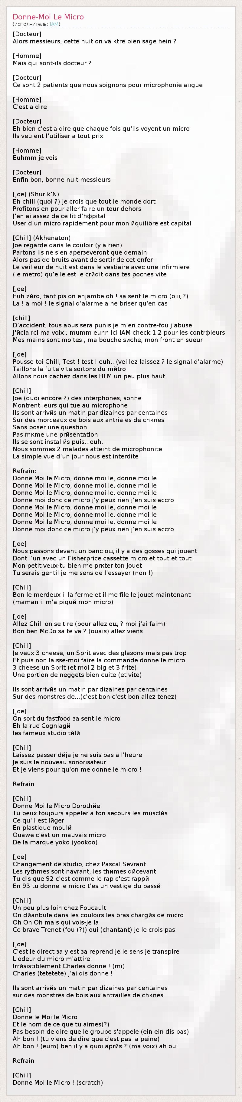 [Docteur] Alors messieurs, cette nuit on va кtre bien sage hein ? [Homme] Mais qui sont-ils docteur ? [Docteur] Ce sont 2 patients que nous soignons pour microphonie aпgue [Homme] C'est а dire [Docteur] Eh bien c'est а dire que chaque fois qu'ils voyent un micro Ils veulent l'utiliser а tout prix [Homme] Euhmm je vois [Docteur] Enfin bon, bonne nuit messieurs [Joe] (Shurik'N) Eh chill (quoi ?) je crois que tout le monde dort Profitons en pour aller faire un tour dehors J'en ai assez de ce lit d'hфpital User d'un micro rapidement pour mon йquilibre est capital [Chill] (Akhenaton) Joe regarde dans le couloir (y a rien) Partons ils ne s'en aperзeveront que demain Alors pas de bruits avant de sortir de cet enfer Le veilleur de nuit est dans le vestiaire avec une infirmiere (le metro) qu'elle est le crйdit dans tes poches vite [Joe] Euh zйro, tant pis on enjambe oh ! зa sent le micro (oщ ?) Lа ! а moi ! le signal d'alarme а ne briser qu'en cas [chill] D'accident, tous abus sera punis je m'en contre-fou j'abuse J'йclairci ma voix : mumm eunn ici IAM check 1 2 pour les contrфleurs Mes mains sont moites , ma bouche sиche, mon front en sueur [Joe] Pousse-toi Chill, Test ! test ! euh...(veillez laissez ? le signal d'alarme) Taillons la fuite vite sortons du mйtro Allons nous cachez dans les HLM un peu plus haut [Chill] Joe (quoi encore ?) des interphones, sonne Montrent leurs qui tue au microphone Ils sont arrivйs un matin par dizaines par centaines Sur des morceaux de bois aux antriales de chкnes Sans poser une question Pas mкme une prйsentation Ils se sont installйs puis...euh.. Nous sommes 2 malades atteint de microphonite La simple vue d'un jour nous est interdite Refrain: Donne Moi le Micro, donne moi le, donne moi le Donne Moi le Micro, donne moi le, donne moi le Donne Moi le Micro, donne moi le, donne moi le Donne moi donc ce micro j'y peux rien j'en suis accro Donne Moi le Micro, donne moi le, donne moi le Donne Moi le Micro, donne moi le, donne moi le Donne Moi le Micro, donne moi le, donne moi le Donne moi donc ce micro j'y peux rien j'en suis accro [Joe] Nous passons devant un banc oщ il y a des gosses qui jouent Dont l'un avec un Fisherprice cassette micro et tout et tout Mon petit veux-tu bien me prкter ton jouet Tu serais gentil je me sens de l'essayer (non !) [Chill] Bon le merdeux il la ferme et il me file le jouet maintenant (maman il m'a piquй mon micro) [Joe] Allez Chill on se tire (pour allez oщ ? moi j'ai faim) Bon ben McDo зa te va ? (ouais) allez viens [Chill] Je veux 3 cheese, un Sprit avec des glaзons mais pas trop Et puis non laisse-moi faire la commande donne le micro 3 cheese un Sprit (et moi 2 big et 3 frite) Une portion de neggets bien cuite (et vite) Ils sont arrivйs un matin par dizaines par centaines Sur des monstres de...(c'est bon c'est bon allez tenez) [Joe] On sort du fastfood зa sent le micro Eh la rue Cogniagй les fameux studio tйlй [Chill] Laissez passer dйjа je ne suis pas а l'heure Je suis le nouveau sonorisateur Et je viens pour qu'on me donne le micro ! Refrain [Chill] Donne Moi le Micro Dorothйe Tu peux toujours appeler а ton secours les musclйs Ce qu'il est lйger En plastique moulй Ouawe c'est un mauvais micro De la marque yoko (yookoo) [Joe] Changement de studio, chez Pascal Sevrant Les rythmes sont navrant, les thиmes dйcevant Tu dis que 92 c'est comme le rap c'est rappй En 93 tu donne le micro t'es un vestige du passй [Chill] Un peu plus loin chez Foucault On dйanbule dans les couloirs les bras chargйs de micro Oh Oh Oh mais qui vois-je lа Ce brave Trenet (fou (?)) oui (chantant) je le crois pas [Joe] C'est le direct зa y est зa reprend je le sens je transpire L'odeur du micro m'attire Irrйsistiblement Charles donne ! (mi) Charles (tetetete) j'ai dis donne ! Ils sont arrivйs un matin par dizaines par centaines sur des monstres de bois aux antrailles de chкnes [Chill] Donne le Moi le Micro Et le nom de ce que tu aimes(?) Pas besoin de dire que le groupe s'appele (ein ein dis pas) Ah bon ! (tu viens de dire que c'est pas la peine) Ah bon ! (eum) ben il y a quoi aprйs ? (ma voix) ah oui Refrain [Chill] Donne Moi le Micro ! (scratch)