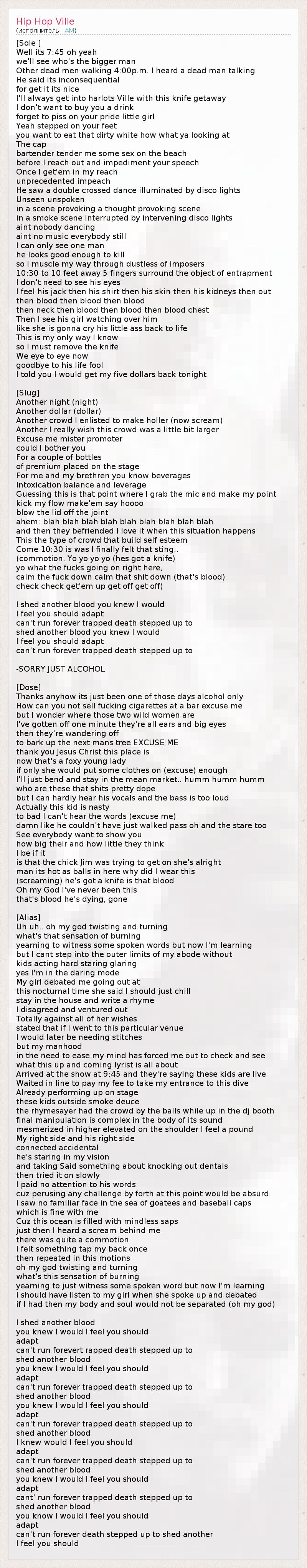 [Sole ] Well its 7:45 oh yeah we'll see who's the bigger man Other dead men walking 4:00p.m. I heard a dead man talking He said its inconsequential for get it its nice I'll always get into harlots Ville with this knife getaway I don't want to buy you a drink forget to piss on your pride little girl Yeah stepped on your feet you want to eat that dirty white how what ya looking at The cap bartender tender me some sex on the beach before I reach out and impediment your speech Once I get'em in my reach unprecedented impeach He saw a double crossed dance illuminated by disco lights Unseen unspoken in a scene provoking a thought provoking scene in a smoke scene interrupted by intervening disco lights aint nobody dancing aint no music everybody still I can only see one man he looks good enough to kill so I muscle my way through dustless of imposers 10:30 to 10 feet away 5 fingers surround the object of entrapment I don't need to see his eyes I feel his jack then his shirt then his skin then his kidneys then out then blood then blood then blood then neck then blood then blood then blood chest Then I see his girl watching over him like she is gonna cry his little ass back to life This is my only way I know so I must remove the knife We eye to eye now goodbye to his life fool I told you I would get my five dollars back tonight [Slug] Another night (night) Another dollar (dollar) Another crowd I enlisted to make holler (now scream) Another I really wish this crowd was a little bit larger Excuse me mister promoter could I bother you For a couple of bottles of premium placed on the stage For me and my brethren you know beverages Intoxication balance and leverage Guessing this is that point where I grab the mic and make my point kick my flow make'em say hoooo blow the lid off the joint ahem: blah blah blah blah blah blah blah blah blah and then they befriended I love it when this situation happens This the type of crowd that build self esteem Come 10:30 is was I finally felt that sting.. (commotion. Yo yo yo yo (hes got a knife) yo what the fucks going on right here, calm the fuck down calm that shit down (that's blood) check check get'em up get off get off) I shed another blood you knew I would I feel you should adapt can't run forever trapped death stepped up to shed another blood you knew I would I feel you should adapt can't run forever trapped death stepped up to -SORRY JUST ALCOHOL [Dose] Thanks anyhow its just been one of those days alcohol only How can you not sell fucking cigarettes at a bar excuse me but I wonder where those two wild women are I've gotten off one minute they're all ears and big eyes then they're wandering off to bark up the next mans tree EXCUSE ME thank you Jesus Christ this place is now that's a foxy young lady if only she would put some clothes on (excuse) enough I'll just bend and stay in the mean market.. humm humm humm who are these that shits pretty dope but I can hardly hear his vocals and the bass is too loud Actually this kid is nasty to bad I can't hear the words (excuse me) damn like he couldn't have just walked pass oh and the stare too See everybody want to show you how big their and how little they think I be if it is that the chick Jim was trying to get on she's alright man its hot as balls in here why did I wear this (screaming) he's got a knife is that blood Oh my God I've never been this that's blood he's dying, gone [Alias] Uh uh.. oh my god twisting and turning what's that sensation of burning yearning to witness some spoken words but now I'm learning but I cant step into the outer limits of my abode without kids acting hard staring glaring yes I'm in the daring mode My girl debated me going out at this nocturnal time she said I should just chill stay in the house and write a rhyme I disagreed and ventured out Totally against all of her wishes stated that if I went to this particular venue I would later be needing stitches but my manhood in the need to ease my mind has forced me out to check and see what this up and coming lyrist is all about Arrived at the show at 9:45 and they're saying these kids are live Waited in line to pay my fee to take my entrance to this dive Already performing up on stage these kids outside smoke deuce the rhymesayer had the crowd by the balls while up in the dj booth final manipulation is complex in the body of its sound mesmerized in higher elevated on the shoulder I feel a pound My right side and his right side connected accidental he's staring in my vision and taking Said something about knocking out dentals then tried it on slowly I paid no attention to his words cuz perusing any challenge by forth at this point would be absurd I saw no familiar face in the sea of goatees and baseball caps which is fine with me Cuz this ocean is filled with mindless saps just then I heard a scream behind me there was quite a commotion I felt something tap my back once then repeated in this motions oh my god twisting and turning what's this sensation of burning yearning to just witness some spoken word but now I'm learning I should have listen to my girl when she spoke up and debated if I had then my body and soul would not be separated (oh my god) I shed another blood you knew I would I feel you should adapt can't run forevert rapped death stepped up to shed another blood you knew I would I feel you should adapt can't run forever trapped death stepped up to shed another blood you knew I would I feel you should adapt can't run forever trapped death stepped up to shed another blood I knew would I feel you should adapt can't run forever trapped death stepped up to shed another blood you knew I would I feel you should adapt cant' run forever trapped death stepped up to shed another blood you know I would I feel you should adapt can't run forever death stepped up to shed another I feel you should