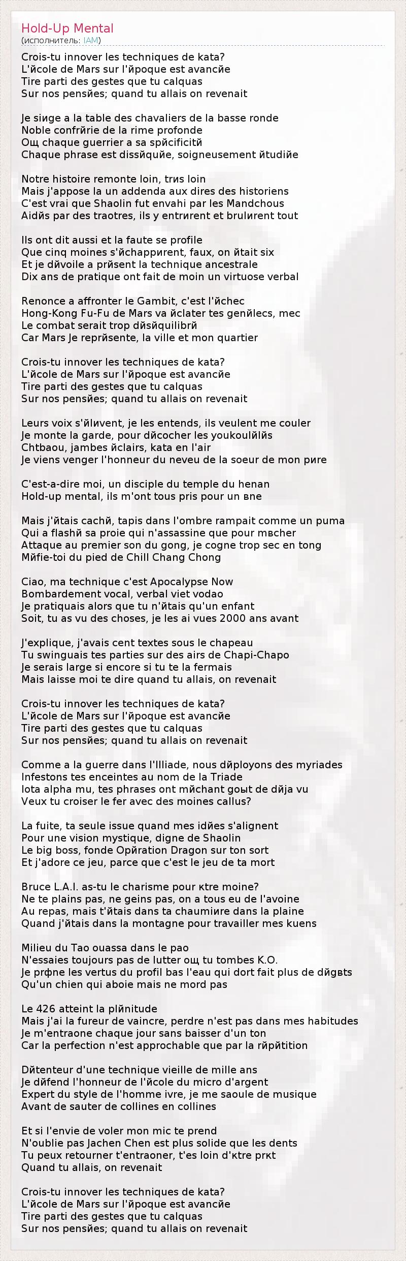 Crois-tu innover les techniques de kata? L'йcole de Mars sur l'йpoque est avancйe Tire parti des gestes que tu calquas Sur nos pensйes; quand tu allais on revenait Je siиge а la table des chavaliers de la basse ronde Noble confrйrie de la rime profonde Oщ chaque guerrier a sa spйcificitй Chaque phrase est dissйquйe, soigneusement йtudiйe Notre histoire remonte loin, trиs loin Mais j'appose lа un addenda aux dires des historiens C'est vrai que Shaolin fut envahi par les Mandchous Aidйs par des traоtres, ils y entrиrent et brulиrent tout Ils ont dit aussi et la faute se profile Que cinq moines s'йchappиrent, faux, on йtait six Et je dйvoile а prйsent la technique ancestrale Dix ans de pratique ont fait de moin un virtuose verbal Renonce а affronter le Gambit, c'est l'йchec Hong-Kong Fu-Fu de Mars va йclater tes genйlecs, mec Le combat serait trop dйsйquilibrй Car Mars Je reprйsente, la ville et mon quartier Crois-tu innover les techniques de kata? L'йcole de Mars sur l'йpoque est avancйe Tire parti des gestes que tu calquas Sur nos pensйes; quand tu allais on revenait Leurs voix s'йlиvent, je les entends, ils veulent me couler Je monte la garde, pour dйcocher les youkoulйlйs Chtbaou, jambes йclairs, kata en l'air Je viens venger l'honneur du neveu de la soeur de mon pиre C'est-а-dire moi, un disciple du temple du henan Hold-up mental, ils m'ont tous pris pour un вne Mais j'йtais cachй, tapis dans l'ombre rampait comme un puma Qui a flashй sa proie qui n'assassine que pour mвcher Attaque au premier son du gong, je cogne trop sec en tong Mйfie-toi du pied de Chill Chang Chong Ciao, ma technique c'est Apocalypse Now Bombardement vocal, verbal viet vodao Je pratiquais alors que tu n'йtais qu'un enfant Soit, tu as vu des choses, je les ai vues 2000 ans avant J'explique, j'avais cent textes sous le chapeau Tu swinguais tes parties sur des airs de Chapi-Chapo Je serais large si encore si tu te la fermais Mais laisse moi te dire quand tu allais, on revenait Crois-tu innover les techniques de kata? L'йcole de Mars sur l'йpoque est avancйe Tire parti des gestes que tu calquas Sur nos pensйes; quand tu allais on revenait Comme а la guerre dans l'Illiade, nous dйployons des myriades Infestons tes enceintes au nom de la Triade Iota alpha mu, tes phrases ont mйchant goыt de dйjа vu Veux tu croiser le fer avec des moines callus? La fuite, ta seule issue quand mes idйes s'alignent Pour une vision mystique, digne de Shaolin Le big boss, fonde Opйration Dragon sur ton sort Et j'adore ce jeu, parce que c'est le jeu de ta mort Bruce L.A.I. as-tu le charisme pour кtre moine? Ne te plains pas, ne geins pas, on a tous eu de l'avoine Au repas, mais t'йtais dans ta chaumiиre dans la plaine Quand j'йtais dans la montagne pour travailler mes kuens Milieu du Tao ouassa dans le pao N'essaies toujours pas de lutter oщ tu tombes K.O. Je prфne les vertus du profil bas l'eau qui dort fait plus de dйgвts Qu'un chien qui aboie mais ne mord pas Le 426 atteint la plйnitude Mais j'ai la fureur de vaincre, perdre n'est pas dans mes habitudes Je m'entraоne chaque jour sans baisser d'un ton Car la perfection n'est approchable que par la rйpйtition Dйtenteur d'une technique vieille de mille ans Je dйfend l'honneur de l'йcole du micro d'argent Expert du style de l'homme ivre, je me saoule de musique Avant de sauter de collines en collines Et si l'envie de voler mon mic te prend N'oublie pas Jachen Chen est plus solide que les dents Tu peux retourner t'entraоner, t'es loin d'кtre prкt Quand tu allais, on revenait Crois-tu innover les techniques de kata? L'йcole de Mars sur l'йpoque est avancйe Tire parti des gestes que tu calquas Sur nos pensйes; quand tu allais on revenait