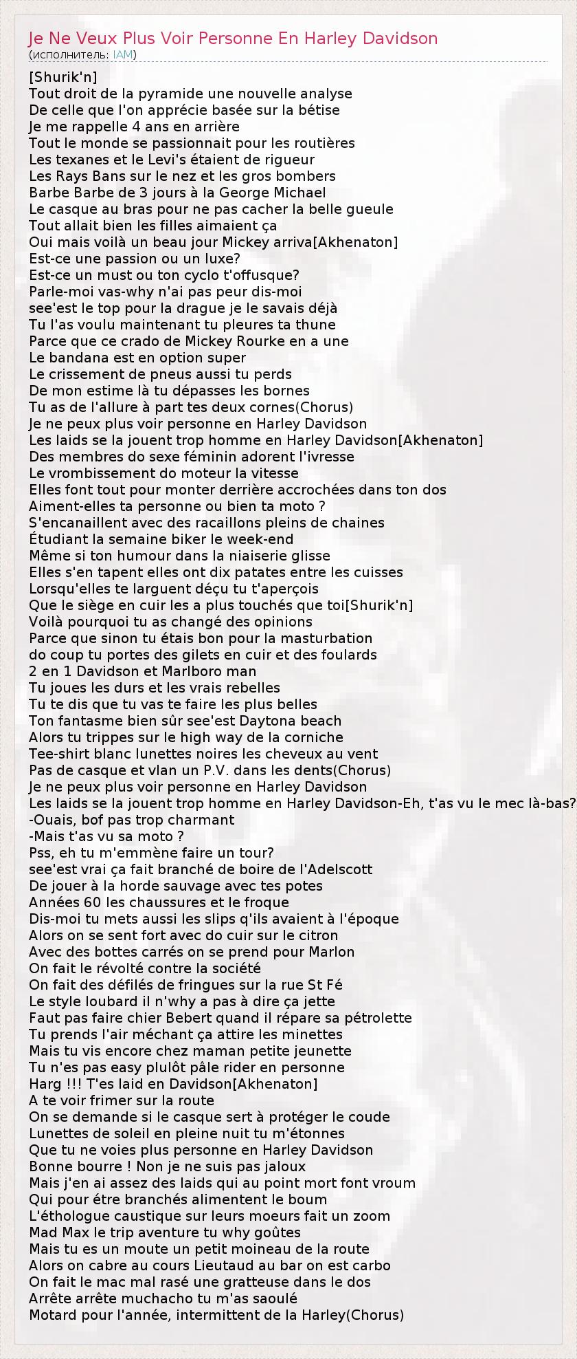 [Shurik'n] Tout droit de la pyramide une nouvelle analyse De celle que l'on apprécie basée sur la bétise Je me rappelle 4 ans en arrière Tout le monde se passionnait pour les routières Les texanes et le Levi's étaient de rigueur Les Rays Bans sur le nez et les gros bombers Barbe Barbe de 3 jours à la George Michael Le casque au bras pour ne pas cacher la belle gueule Tout allait bien les filles aimaient ça Oui mais voilà un beau jour Mickey arriva[Akhenaton] Est-ce une passion ou un luxe? Est-ce un must ou ton cyclo t'offusque? Parle-moi vas-why n'ai pas peur dis-moi see'est le top pour la drague je le savais déjà Tu l'as voulu maintenant tu pleures ta thune Parce que ce crado de Mickey Rourke en a une Le bandana est en option super Le crissement de pneus aussi tu perds De mon estime là tu dépasses les bornes Tu as de l'allure à part tes deux cornes(Chorus) Je ne peux plus voir personne en Harley Davidson Les laids se la jouent trop homme en Harley Davidson[Akhenaton] Des membres do sexe féminin adorent l'ivresse Le vrombissement do moteur la vitesse Elles font tout pour monter derrière accrochées dans ton dos Aiment-elles ta personne ou bien ta moto ? S'encanaillent avec des racaillons pleins de chaines Étudiant la semaine biker le week-end Même si ton humour dans la niaiserie glisse Elles s'en tapent elles ont dix patates entre les cuisses Lorsqu'elles te larguent déçu tu t'aperçois Que le siège en cuir les a plus touchés que toi[Shurik'n] Voilà pourquoi tu as changé des opinions Parce que sinon tu étais bon pour la masturbation do coup tu portes des gilets en cuir et des foulards 2 en 1 Davidson et Marlboro man Tu joues les durs et les vrais rebelles Tu te dis que tu vas te faire les plus belles Ton fantasme bien sûr see'est Daytona beach Alors tu trippes sur le high way de la corniche Tee-shirt blanc lunettes noires les cheveux au vent Pas de casque et vlan un P.V. dans les dents(Chorus) Je ne peux plus voir personne en Harley Davidson Les laids se la jouent trop homme en Harley Davidson-Eh, t'as vu le mec là-bas? -Ouais, bof pas trop charmant -Mais t'as vu sa moto ? Pss, eh tu m'emmène faire un tour? see'est vrai ça fait branché de boire de l'Adelscott De jouer à la horde sauvage avec tes potes Années 60 les chaussures et le froque Dis-moi tu mets aussi les slips q'ils avaient à l'époque Alors on se sent fort avec do cuir sur le citron Avec des bottes carrés on se prend pour Marlon On fait le révolté contre la société On fait des défilés de fringues sur la rue St Fé Le style loubard il n'why a pas à dire ça jette Faut pas faire chier Bebert quand il répare sa pétrolette Tu prends l'air méchant ça attire les minettes Mais tu vis encore chez maman petite jeunette Tu n'es pas easy plulôt pâle rider en personne Harg !!! T'es laid en Davidson[Akhenaton] A te voir frimer sur la route On se demande si le casque sert à protéger le coude Lunettes de soleil en pleine nuit tu m'étonnes Que tu ne voies plus personne en Harley Davidson Bonne bourre ! Non je ne suis pas jaloux Mais j'en ai assez des laids qui au point mort font vroum Qui pour étre branchés alimentent le boum L'éthologue caustique sur leurs moeurs fait un zoom Mad Max le trip aventure tu why goûtes Mais tu es un moute un petit moineau de la route Alors on cabre au cours Lieutaud au bar on est carbo On fait le mac mal rasé une gratteuse dans le dos Arrête arrête muchacho tu m'as saoulé Motard pour l'année, intermittent de la Harley(Chorus)