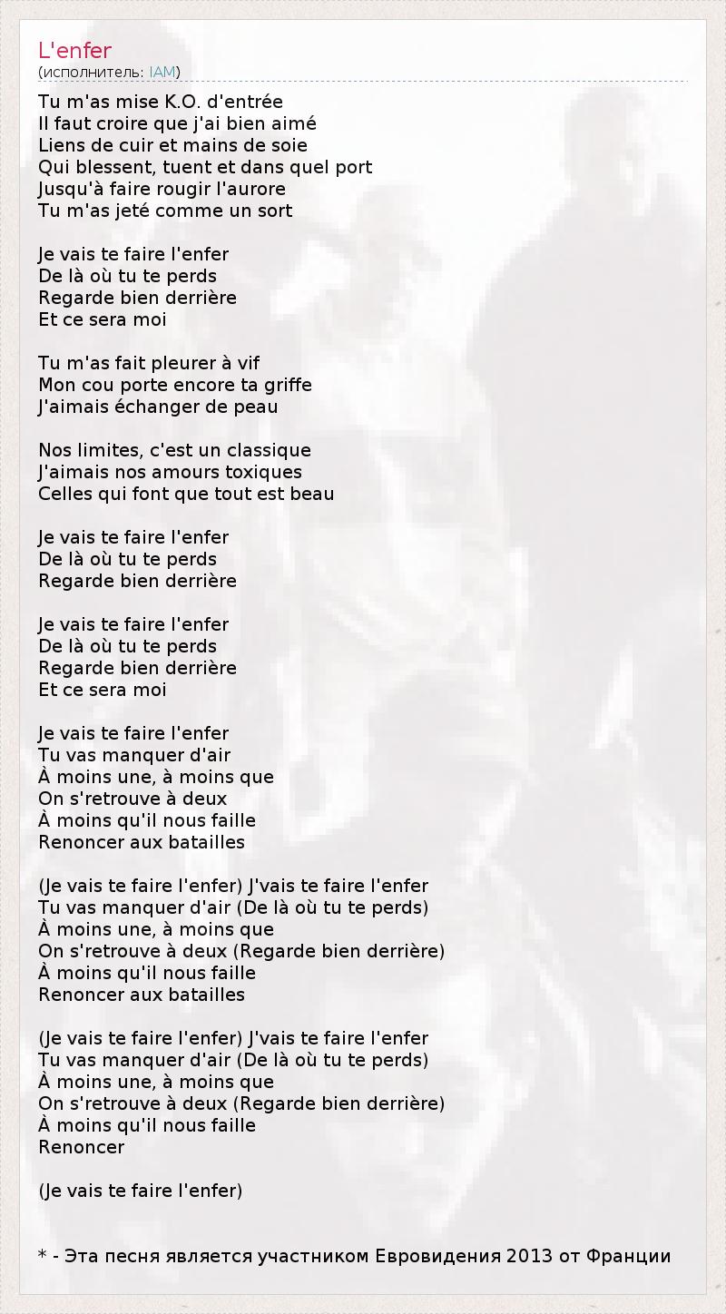 Tu m'as mise K.O. d'entrée Il faut croire que j'ai bien aimé Liens de cuir et mains de soie Qui blessent, tuent et dans quel port Jusqu'à faire rougir l'aurore Tu m'as jeté comme un sort Je vais te faire l'enfer De là où tu te perds Regarde bien derrière Et ce sera moi Tu m'as fait pleurer à vif Mon cou porte encore ta griffe J'aimais échanger de peau Nos limites, c'est un classique J'aimais nos amours toxiques Celles qui font que tout est beau Je vais te faire l'enfer De là où tu te perds Regarde bien derrière Je vais te faire l'enfer De là où tu te perds Regarde bien derrière Et ce sera moi Je vais te faire l'enfer Tu vas manquer d'air À moins une, à moins que On s'retrouve à deux À moins qu'il nous faille Renoncer aux batailles (Je vais te faire l'enfer) J'vais te faire l'enfer Tu vas manquer d'air (De là où tu te perds) À moins une, à moins que On s'retrouve à deux (Regarde bien derrière) À moins qu'il nous faille Renoncer aux batailles (Je vais te faire l'enfer) J'vais te faire l'enfer Tu vas manquer d'air (De là où tu te perds) À moins une, à moins que On s'retrouve à deux (Regarde bien derrière) À moins qu'il nous faille Renoncer (Je vais te faire l'enfer) * - Эта песня является участником Евровидения 2013 от Франции
