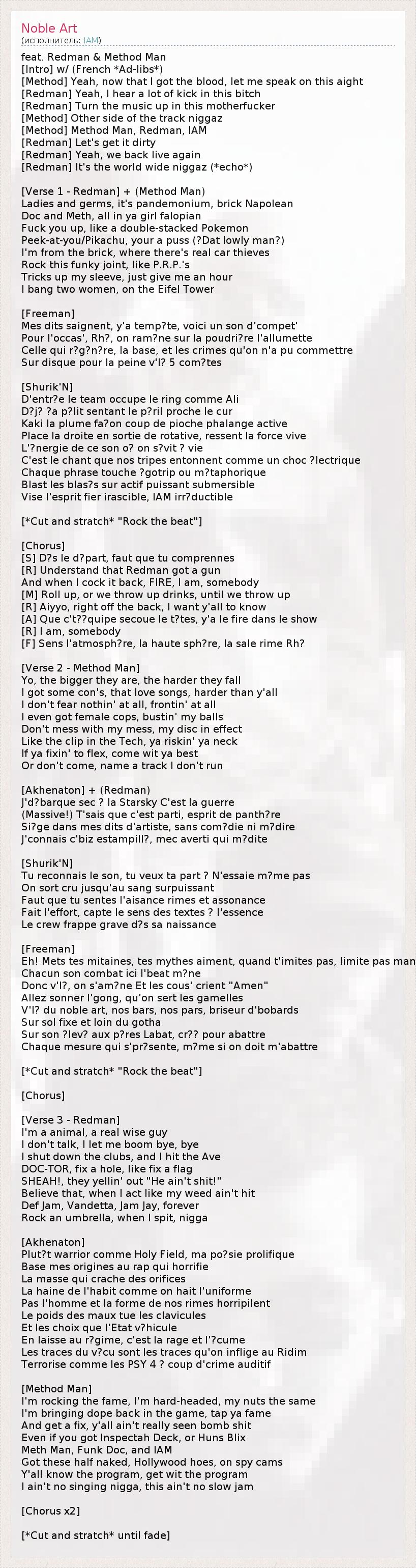 feat. Redman & Method Man [Intro] w/ (French *Ad-libs*) [Method] Yeah, now that I got the blood, let me speak on this aight [Redman] Yeah, I hear a lot of kick in this bitch [Redman] Turn the music up in this motherfucker [Method] Other side of the track niggaz [Method] Method Man, Redman, IAM [Redman] Let's get it dirty [Redman] Yeah, we back live again [Redman] It's the world wide niggaz (*echo*) [Verse 1 - Redman] + (Method Man) Ladies and germs, it's pandemonium, brick Napolean Doc and Meth, all in ya girl falopian Fuck you up, like a double-stacked Pokemon Peek-at-you/Pikachu, your a puss (?Dat lowly man?) I'm from the brick, where there's real car thieves Rock this funky joint, like P.R.P.'s Tricks up my sleeve, just give me an hour I bang two women, on the Eifel Tower [Freeman] Mes dits saignent, y'a temp?te, voici un son d'compet' Pour l'occas', Rh?, on ram?ne sur la poudri?re l'allumette Celle qui r?g?n?re, la base, et les crimes qu'on n'a pu commettre Sur disque pour la peine v'l? 5 com?tes [Shurik'N] D'entr?e le team occupe le ring comme Ali D?j? ?a p?lit sentant le p?ril proche le cur Kaki la plume fa?on coup de pioche phalange active Place la droite en sortie de rotative, ressent la force vive L'?nergie de ce son o? on s?vit ? vie C'est le chant que nos tripes entonnent comme un choc ?lectrique Chaque phrase touche ?gotrip ou m?taphorique Blast les blas?s sur actif puissant submersible Vise l'esprit fier irascible, IAM irr?ductible [*Cut and stratch* "Rock the beat"] [Chorus] [S] D?s le d?part, faut que tu comprennes [R] Understand that Redman got a gun And when I cock it back, FIRE, I am, somebody [M] Roll up, or we throw up drinks, until we throw up [R] Aiyyo, right off the back, I want y'all to know [A] Que c't??quipe secoue le t?tes, y'a le fire dans le show [R] I am, somebody [F] Sens l'atmosph?re, la haute sph?re, la sale rime Rh? [Verse 2 - Method Man] Yo, the bigger they are, the harder they fall I got some con's, that love songs, harder than y'all I don't fear nothin' at all, frontin' at all I even got female cops, bustin' my balls Don't mess with my mess, my disc in effect Like the clip in the Tech, ya riskin' ya neck If ya fixin' to flex, come wit ya best Or don't come, name a track I don't run [Akhenaton] + (Redman) J'd?barque sec ? la Starsky C'est la guerre (Massive!) T'sais que c'est parti, esprit de panth?re Si?ge dans mes dits d'artiste, sans com?die ni m?dire J'connais c'biz estampill?, mec averti qui m?dite [Shurik'N] Tu reconnais le son, tu veux ta part ? N'essaie m?me pas On sort cru jusqu'au sang surpuissant Faut que tu sentes l'aisance rimes et assonance Fait l'effort, capte le sens des textes ? l'essence Le crew frappe grave d?s sa naissance [Freeman] Eh! Mets tes mitaines, tes mythes aiment, quand t'imites pas, limite pas man Chacun son combat ici l'beat m?ne Donc v'l?, on s'am?ne Et les cous' crient "Amen" Allez sonner l'gong, qu'on sert les gamelles V'l? du noble art, nos bars, nos pars, briseur d'bobards Sur sol fixe et loin du gotha Sur son ?lev? aux p?res Labat, cr?? pour abattre Chaque mesure qui s'pr?sente, m?me si on doit m'abattre [*Cut and stratch* "Rock the beat"] [Chorus] [Verse 3 - Redman] I'm a animal, a real wise guy I don't talk, I let me boom bye, bye I shut down the clubs, and I hit the Ave DOC-TOR, fix a hole, like fix a flag SHEAH!, they yellin' out "He ain't shit!" Believe that, when I act like my weed ain't hit Def Jam, Vandetta, Jam Jay, forever Rock an umbrella, when I spit, nigga [Akhenaton] Plut?t warrior comme Holy Field, ma po?sie prolifique Base mes origines au rap qui horrifie La masse qui crache des orifices La haine de l'habit comme on hait l'uniforme Pas l'homme et la forme de nos rimes horripilent Le poids des maux tue les clavicules Et les choix que l'Etat v?hicule En laisse au r?gime, c'est la rage et l'?cume Les traces du v?cu sont les traces qu'on inflige au Ridim Terrorise comme les PSY 4 ? coup d'crime auditif [Method Man] I'm rocking the fame, I'm hard-headed, my nuts the same I'm bringing dope back in the game, tap ya fame And get a fix, y'all ain't really seen bomb shit Even if you got Inspectah Deck, or Huns Blix Meth Man, Funk Doc, and IAM Got these half naked, Hollywood hoes, on spy cams Y'all know the program, get wit the program I ain't no singing nigga, this ain't no slow jam [Chorus x2] [*Cut and stratch* until fade]