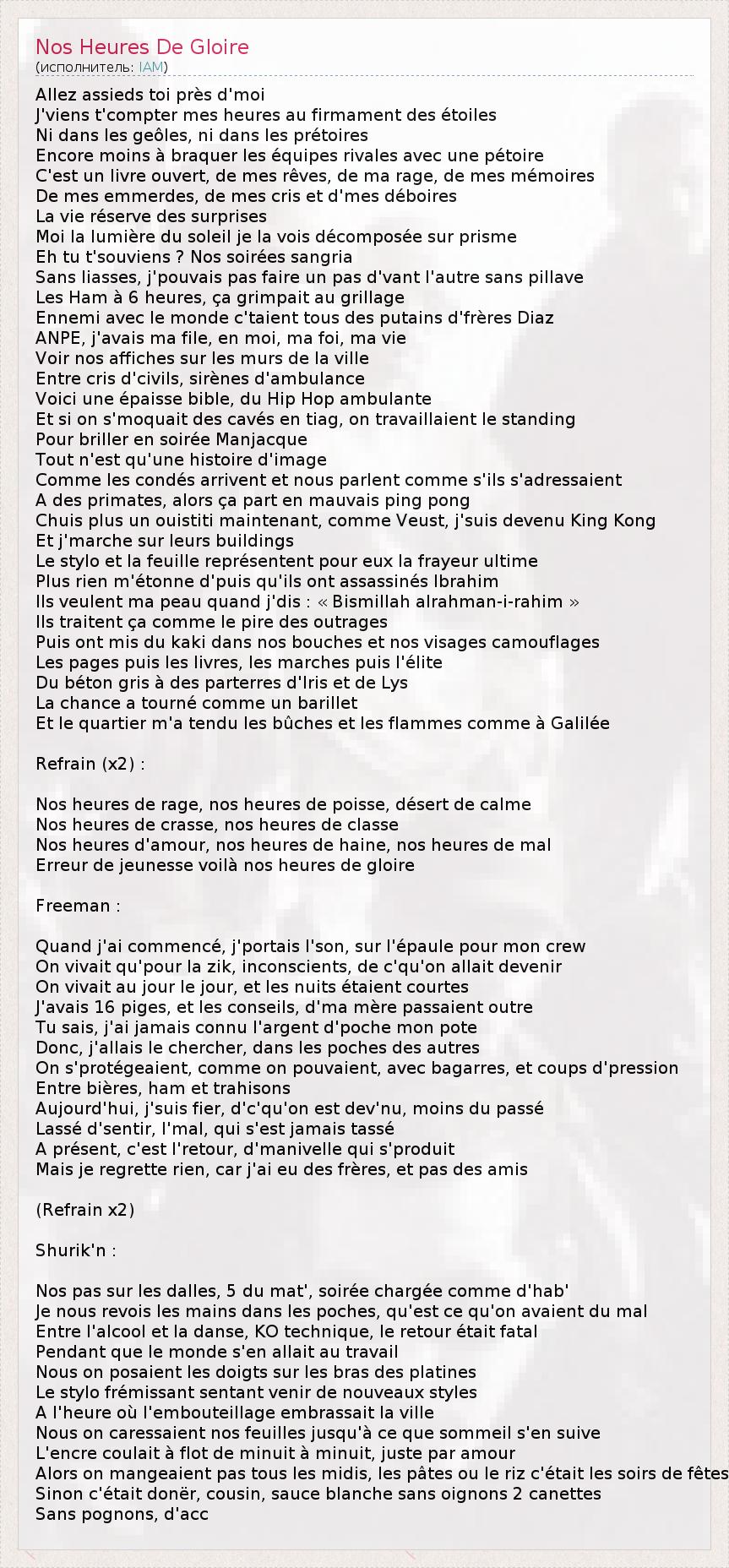 Allez assieds Toi Pres d' МВД J'viens t'compter MES Heures а.е. тверди Звездного Ni данс ле geôles , Ni данс ле prétoires Encore Moins à braquer ле Команды rivales АВЭК ипе pétoire C'est ООН Livre OUVERT , де мес rêves , де ма ярость, де мес записок De MES emmerdes , де мес Cris др. d' мес déboires La Vie резерва де сюрпризы Moi La Lumière дю Солей JE ла VOIS décomposée сюр Prisme Эх ту t'souviens ? Нос вечерах сангрию Sans liasses , j'pouvais па свободной конкуренции ООН па d' Вант L'Autre без pillave Les Хэм 6 Heures , Калифорния grimpait а.е. ростверк Ennemi АВЭК Le Monde c'taient Tous де putains d' Freres Диас ANPE , J'avais ма файл , ан Moi , ма фол , ма соперничают Воир NOS Постеры сюр -ле- Murs De La Ville Entre Cris d' Civils , Sirènes d' скорой помощи Voici ипе épaisse Библия , дю Хип-хоп Ambulante Et си на s'moquait де пещеры ан tiag , на travaillaient ле стоя Налейте Бриллер ан soirée Manjacque Tout n'est qu'une Histoire d' изображение Comme ле Конде arrivent др. ноус parlent Comme s'ils s'adressaient А де приматов , Alors ça часть ан дурным пинг-понг Chuis ООН-плюс Ouistiti Maintenant , Comme Veust , j'suis devenu Кинг-Конг Et j'marche сюр Leurs здания Le Stylo др. ла Feuille représentent залить еих ла frayeur Ultime Плюс Rien m'étonne d' Puis qu'ils ОНТ assassinés Ибрагим Ils veulent ма Peau Quand j'dis : « Рисале alrahman -и- Рахим » Ils traitent CA Comme ле Pire де посягательство Puis ОНТ неправильно дю хаки данс NOS Буш и др. NOS лики маскируют Les страницы Puis ле ливров , ле марши Puis l' элита Du béton Гри à де партеры d' Iris и др. де Лис Ла шансTourné Comme ООН barillet Et Le Quartier m'a тенду ле Buches др. ле Flammes Comme à Galilée Воздержитесь ( x2 ) : Nos часов назад де ярость , № часов назад де poisse , пустыня де Calme Нос часов назад де crasse , № часов назад де Classe Нос часов назад d'Amour , № часов назад де Хейн , № часов назад де мал Erreur де Jeunesse вуаля NOS часов назад де Глуар Фриман : Quand j'ai начать , j'portais l' сына , субъективной épaule залить Пн экипаж На vivait qu'pour ла ZIK , inconscients , де c'qu'on allait Devenir На vivait а.е. Jour ле подмастерье, и др. Les Nuits étaient Courtes J'avais 16 Piges и др. ле CONSEILS , D'MA mère passaient экстравагантный Ту ВОФК , j'ai Jamais connu l' серебро d' поче пн Потье Donc , j'allais ле Chercher , данс ле poches де Autres На s'protégeaient , Comme на pouvaient , ауес bagarres , ET переворотов депрессии Entre Bieres , ветчина и др. trahisons Aujourd'hui , j'suis литель , d' c'qu'on Предполагаемое dev'nu , Moins дю частью прошлого Лассе d' Sentir , l' мал , Квай s'est Jamais Tasse Представьте, c'est l' Retour , d' manivelle Квай s'produit Маис JE Regrette Rien , автомобиль j'ai ЕС де Freres, и др. па Des Amis ( Припев х2) Shurik'n : Nos па сюр -ле- Даллес , 5 -дю- мат " , soirée Залогодержатель Comme d' хаб " Je Nous revois ле сети данс ле poches , qu'est се qu'on avaient дю мал Entre l' спирт и др. ла Данс , КО техника , ле Retour était фатальным Подвеска дие Le Monde s'en allait а.е. изнурение Разум на posaient ле Doigts сюр -ле- бюстгальтеров де platines Le Stylo frémissant sentant venir де Nouveaux стили A l' Heure où l' EMBOUTEILLAGE embrassait La Ville Разум на caressaient н.у.к Feuilles jusqu'à се дие Sommeil s'en suive L' ENCRE coulait à флот де Minuit à Minuit , Жюст амур номинальной Alors на mangeaient па Tous Les МИДИС , ле паштеты НУ ле Riz C'était ле soirs де fêtes Синон C'était Döner , двоюродный брат , соус бланш Sans Oignons 2 Canettes Sans pognons , d' согласно