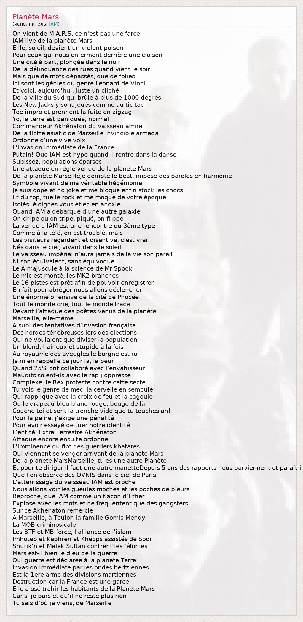 On vient de M.A.R.S. ce n'est pas une farce IAM live de la planète Mars Eille, soleil, devient un violent poison Pour ceux qui nous enferment derrière une cloison Une cité à part, plongée dans le noir De la délinquance des rues quand vient le soir Mais que de mots dépassés, que de folies Ici sont les génies du genre Léonard de Vinci Et voici, aujourd'hui, juste un cliché De la ville du Sud qui brûle à plus de 1000 degrés Les New Jacks y sont joués comme au tic tac Toe impro et prennent la fuite en zigzag Yo, la terre est paniquée, normal Commandeur Akhénaton du vaisseau amiral De la flotte asiatic de Marseille invincible armada Ordonne d'une vive voix L'invasion immédiate de la France Putain! Que IAM est hype quand il rentre dans la danse Subissez, populations éparses Une attaque en règle venue de la planète Mars De la planète MarseilleJe dompte le beat, impose des paroles en harmonie Symbole vivant de ma véritable hégémonie Je suis dope et no joke et me bloque enfin stock les chocs Et du top, tue le rock et me moque de votre époque Isolés, éloignés vous étiez en anoxie Quand IAM a débarqué d'une autre galaxie On chipe ou on tripe, piqué, on flippe La venue d'IAM est une rencontre du 3ème type Comme à la télé, on est troublé, mais Les visiteurs regardent et disent vé, c'est vrai Nés dans le ciel, vivant dans le soleil Le vaisseau impérial n'aura jamais de la vie son pareil Ni son équivalent, sans équivoque Le A majuscule à la science de Mr Spock Le mic est monté, les MK2 branchés Le 16 pistes est prêt afin de pouvoir enregistrer En fait pour abréger nous allons déclencher Une énorme offensive de la cité de Phocée Tout le monde crie, tout le monde trace Devant l'attaque des poètes venus de la planète Marseille, elle-même A subi des tentatives d'invasion française Des hordes ténébreuses lors des élections Qui ne voulaient que diviser la population Un blond, haineux et stupide à la fois Au royaume des aveugles le borgne est roi Je m'en rappelle ce jour là, la peur Quand 25% ont collaboré avec l'envahisseur Maudits soient-ils avec le rap j'oppresse Complexe, le Rex proteste contre cette secte Tu vois le genre de mec, la cervelle en semoule Qui rapplique avec la croix de feu et la cagoule Ou le drapeau bleu blanc rouge, bouge de là Couche toi et sent la tronche vide que tu touches ah! Pour la peine, j'exige une pénalité Pour avoir essayé de tuer notre identité L'entité, Extra Terrestre Akhénaton Attaque encore ensuite ordonne L'imminence du flot des guerriers khatares Qui viennent se venger arrivant de la planète Mars De la planète MarsMarseille, tu es une autre Planète Et pour te diriger il faut une autre manetteDepuis 5 ans des rapports nous parviennent et paraît-il Que l'on observe des OVNIS dans le ciel de Paris L'atterrissage du vaisseau IAM est proche Nous allons voir les gueules moches et les poches de pleurs Reproche, que IAM comme un flacon d'Éther Explose avec les mots et ne fréquentent que des gangsters Sur ce Akhenaton remercie A Marseille, à Toulon la famille Gomis-Mendy La MOB criminosicale Les BTF et MB-force, l'alliance de l'islam Imhotep et Kephren et Khéops assistés de Sodi Shurik'n et Malek Sultan contrent les félonies Mars est-il bien le dieu de la guerre Oui guerre est déclarée à la planète Terre Invasion immédiate par les ondes hertziennes Est la 1ère arme des divisions martiennes Destruction car la France est une garce Elle a osé trahir les habitants de la Planète Mars Car si je pars et qu'il ne reste plus rien Tu sais d'où je viens, de Marseille