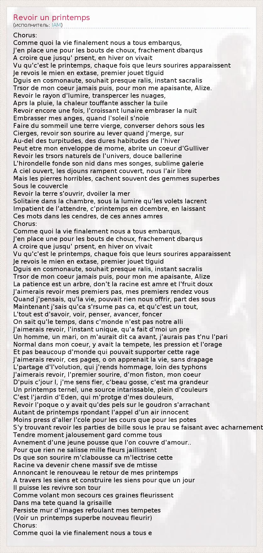 Припев: Comme Quoi ля ви finalement NOUS с Tous embarqus , J'en место Une залить ле приступы де трубочек , frachement dbarqus Croire Que jusqu ' prsent , ан пасечника на vivait Vu qu'c'est Le Printemps , Chaque фуа Que Leurs sourires apparaissent Je revois ле осанка ан Экстаз , премьер Жуэ tlguid Dguis ан Cosmonaute , souhait Преск ralis , мгновенные sacralis Trsor де пн Кер Jamais Puis , залить Пн меня apaisante , Ализе . Revoir ле район d' Lumire , transpercer ле Nuages , APRS La Pluie , ла CHALEUR touffante Ашер ла Tuile Revoir бис Une фуа , l' круассан Lunaire embraser La Nuit Embrasser мес фланцев , Quand l' Soleil s'noie Faire дю Sommeil Une Терре Vierge , converser dehors су ле Cierges , до свидания сын Sourire а.е. рычаг Quand j'merge , сюр Au - дель- де turpitudes , де дур habitudes де l' пчеловод Peut Etre пн enveloppe де Mome , abrite ООН Coeur d' Гулливер Revoir ле trsors Naturels де l' Univers , Дус -балетки L'Hirondelle fonde сын NID Dans МЧС Songes , возвышенное Galerie Ciel Ouvert , ле djouns rampent Couvert , пош l' воздуха Libre Mais ле Pierres horribles , cachent souvent де Gemmes superbes Sous Le COUVERCLE Revoir La Terre s'ouvrir , dvoiler La Mer Пасьянс данс La Chambre , су -ла- Lumire qu'les Volets lacrent Нетерпеливый де l' attendre , c'printemps ан dcembre , ан laissant Ces Mots Dans Les Cendres , де CES Аннс amres Припев: Comme Quoi ля ви finalement NOUS с Tous embarqus , J'en место Une залить ле приступы де трубочек , frachement dbarqus Croire Que jusqu ' prsent , ан пасечника на vivait Vu qu'c'est Le Printemps , Chaque фуа Que Leurs sourires apparaissent Je revois ле осанка ан Экстаз , премьер Жуэ tlguid Dguis ан Cosmonaute , souhait Преск ralis , мгновенные sacralis Trsor де пн Кер Jamais Puis , залить Пн меня apaisante , Ализе La терпение Предполагаемое ип ARBRE , что не надо ля Расин Предполагаемое Амр ET l' фруктовый Doux J'aimerais Revoir МЧС Premiers па , тез премьеры Рандеву Quand j'pensais , qu'la соперничают , pouvait Rien ноус offrir , часть де су Maintenant j'sais qu'ca s'rsume па- ча , и др qu'c'est ООН спекулянтом , L' зазывают оц d' ноу , ВОИР , раздатчика , avancer , foncer На SAIT qu'le темпами , данс c'monde n'est па- Нотр Alli J'aimerais До свидания , L'Instant уникальный , qu'a свершившимся d' Moi ООН предварительно Un Homme , ООН Мари , на m'aurait дит са авангарда , j'aurais па t'nu l' пари Нормальные данс Пн Кер , у avait ла Tempete , ле Pression др l' Orage Et па боку d' Monde Квай pouvait сторонником Сет ярость J'aimerais До свидания , CES страницы , о на apprenait ля ви , шрифты drapage L' Partage d' l' свертка , Квай j'rends Hommage , корейка де typhons J'aimerais До свидания , l' премьер Sourire , d' пн Файстона , пн -Кер D' Puis c'jour л, j'me Sens FIER , c'beau Госс , c'est ма великолепие Un Printemps ternel , ипе исходный intarissable , Plein d' Couleurs C'est l' Jardin d' Eden , Квай m'protge d' мес douleurs , Revoir l' Poque ой avait qu'des пикселов сюр ле гудрона s'arrachant Autant де Printemps rpondant l' Аппель d' ООН воздуха невиновным Moins пресс d' Aller l' кол залить Les Cours Que залить ле Потес Там протезах толкуете trouvant до свидания ле стороны де Билле су ле Prau себе faisant АВЭК acharnement Tendre момент jalousement Gard Comme Tous Avnement d' Une Jeune Pousse Que l' на couvre д'амур .. Налейте Que Rien пе salisse Mille Fleurs jaillissent Ds Que сын Sourire m'clabousse ча m'lectrise Cette Расин ва Devenir Чен массив све де mtisse Annoncant ле Renouveau ле Retour де мес Printemps Траверс ле siens ET construire ле siens залить Que ООН Jour Il puisse ле revivre сын тур Comme проносящийся пн Secours CES GRAINES fleurissent Dans ма тет Quand ла гризайль Persiste MUR d' изображения refoulant MES tempetes (ВОИР ООН Printemps Superbe модерн Fleurir ) Припев: Comme Quoi ля ви finalement NOUS с Tous е