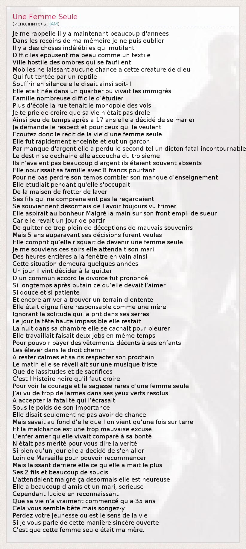 Je me rappelle il y a maintenant beaucoup d'annees Dans les recoins de ma mémoire je ne puis oublier Il y a des choses indélébiles qui mutilent Difficiles epousent ma peau comme un textile Ville hostile des ombres qui se faufilent Mobiles ne laissant aucune chance a cette creature de dieu Qui fut tentée par un reptile Souffrir en silence elle disait ainsi soit-il Elle etait née dans un quartier ou vivait les immigrés Famille nombreuse difficile d'étudier Plus d'école la rue tenait le monopole des vols Je te prie de croire que sa vie n'était pas drole Ainsi peu de temps après a 17 ans elle a décidé de se marier Je demande le respect et pour ceux qui le veulent Ecoutez donc le recit de la vie d'une femme seule Elle fut rapidement enceinte et eut un garcon Par manque d'argent elle a perdu le second tel un dicton fatal incontournable Le destin se dechaine elle accoucha du troisieme Ils n'avaient pas beaucoup d'argent ils étaient souvent absents Elle nourissait sa famille avec 8 francs pourtant Pour ne pas perdre son temps combler son manque d'enseignement Elle etudiait pendant qu'elle s'occupait De la maison de frotter de laver Ses fils qui ne comprenaient pas la regardaient Se souviennent desormais de l'avoir toujours vu trimer Elle aspirait au bonheur Malgré la main sur son front empli de sueur Car elle revait un jour de partir De quitter ce trop plein de déceptions de mauvais souvenirs Mais 5 ans auparavant ses décisions furent veules Elle comprit qu'elle risquait de devenir une femme seule Je me souviens ces soirs elle attendait son mari Des heures entières a la fenêtre en vain ainsi Cette situation demeura quelques années Un jour il vint décider à la quitter D'un commun accord le divorce fut prononcé Si longtemps après putain ce qu'elle devait l'aimer Si douce et si patiente Et encore arriver a trouver un terrain d'entente Elle était digne fière responsable comme une mère Ignorant la solitude qui la prit dans ses serres Le jour la tête haute impassible elle restait La nuit dans sa chambre elle se cachait pour pleurer Elle travaillait faisait deux jobs en même temps Pour pouvoir payer des vêtements décents à ses enfants Les élever dans le droit chemin A rester calmes et sains respecter son prochain Le matin elle se réveillait sur une musique triste Que de lassitudes et de sacrifices C'est l'histoire noire qu'il faut croire Pour voir le courage et la sagesse rares d'une femme seule J'ai vu de trop de larmes dans ses yeux verts resolus A accepter la fatalité qui l'écrasait Sous le poids de son importance Elle disait seulement ne pas avoir de chance Mais savait au fond d'elle que l'on vient qu'une fois sur terre Et la malchance est une trop mauvaise excuse L'enfer amer qu'elle vivait comparé à sa bonté N'était pas merité pour vous dire la verité Si bien qu'un jour elle a decidé de s'en aller Loin de Marseille pour pouvoir recommencer Mais laissant derriere elle ce qu'elle aimait le plus Ses 2 fils et beaucoup de soucis L'attendaient malgré ça desormais elle est heureuse Elle a beaucoup d'amis et un mari, serieuse Cependant lucide en reconnaissant Que sa vie n'a vraiment commencé qu'a 35 ans Cela vous semble bête mais songez-y Perdez votre jeunesse ou est le sens de la vie Si je vous parle de cette manière sincère ouverte C'est que cette femme seule était ma mère.