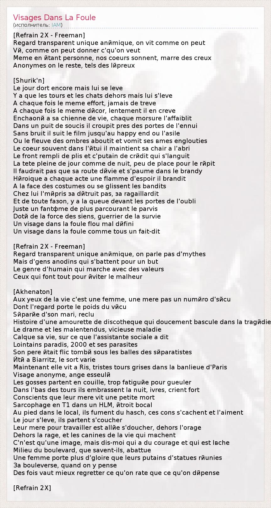 [Refrain 2X - Freeman] Regard transparent unique anйmique, on vit comme on peut Vй, comme on peut donner c'qu'on veut Meme en йtant personne, nos coeurs sonnent, marre des creux Anonymes on le reste, tels des lйpreux [Shurik'n] Le jour dort encore mais lui se leve Y a que les tours et les chats dehors mais lui s'leve A chaque fois le meme effort, jamais de treve A chaque fois le meme dйcor, lentement il en creve Enchaоnй a sa chienne de vie, chaque morsure l'affaiblit Dans un puit de soucis il croupit pres des portes de l'ennui Sans bruit il suit le film jusqu'au happy end ou l'asile Ou le fleuve des ombres aboutit et vomit ses вmes englouties Le coeur souvent dans l'йtui il maintient sa chair a l'abri Le front rempli de plis et c'putain de crйdit qui s'languit La tete pleine de jour comme de nuit, peu de place pour le rйpit Il faudrait pas que sa route dйvie et s'paume dans le brandy Hйroique a chaque acte une flamme d'espoir il brandit A la face des costumes ou se glissent les bandits Chez lui l'mйpris зa dйtruit pas, зa ragaillardit Et de toute faзon, y a la queue devant les portes de l'oubli Juste un fantфme de plus parcourant le parvis Dotй de la force des siens, guerrier de la survie Un visage dans la foule flou mal dйfini Un visage dans la foule comme tous un fait-dit [Refrain 2X - Freeman] Regard transparent unique anйmique, on parle pas d'mythes Mais d'gens anodins qui s'battent pour un but Le genre d'humain qui marche avec des valeurs Ceux qui font tout pour йviter le malheur [Akhenaton] Aux yeux de la vie c'est une femme, une mere pas un numйro d'sйcu Dont l'regard porte le poids du vйcu Sйparйe d'son mari, reclu Histoire d'une amourette de discotheque qui doucement bascule dans la tragйdie Le drame et les malentendus, vicieuse maladie Calque sa vie, sur ce que l'assistante sociale a dit Lointains paradis, 2000 et ses parasites Son pere йtait flic tombй sous les balles des sйparatistes Йtй a Biarritz, le sort varie Maintenant elle vit a Ris, tristes tours grises dans la banlieue d'Paris Visage anonyme, ange esseulй Les gosses partent en couille, trop fatiguйe pour gueuler Dans l'bas des tours ils embrassent la nuit, ivres, crient fort Conscients que leur mere vit une petite mort Sarcophage en T1 dans un HLM, йtroit bocal Au pied dans le local, ils fument du hasch, ces cons s'cachent et l'aiment Le jour s'leve, ils partent s'coucher Leur mere pour travailler est allйe s'doucher, dehors l'orage Dehors la rage, et les canines de la vie qui mвchent C'n'est qu'une image, mais dis-moi qui a du courage et qui est lвche Milieu du boulevard, que savent-ils, abattue Une femme porte plus d'gloire que leurs putains d'statues rйunies Зa bouleverse, quand on y pense Des fois vaut mieux regretter ce qu'on rate que ce qu'on dйpense [Refrain 2X]